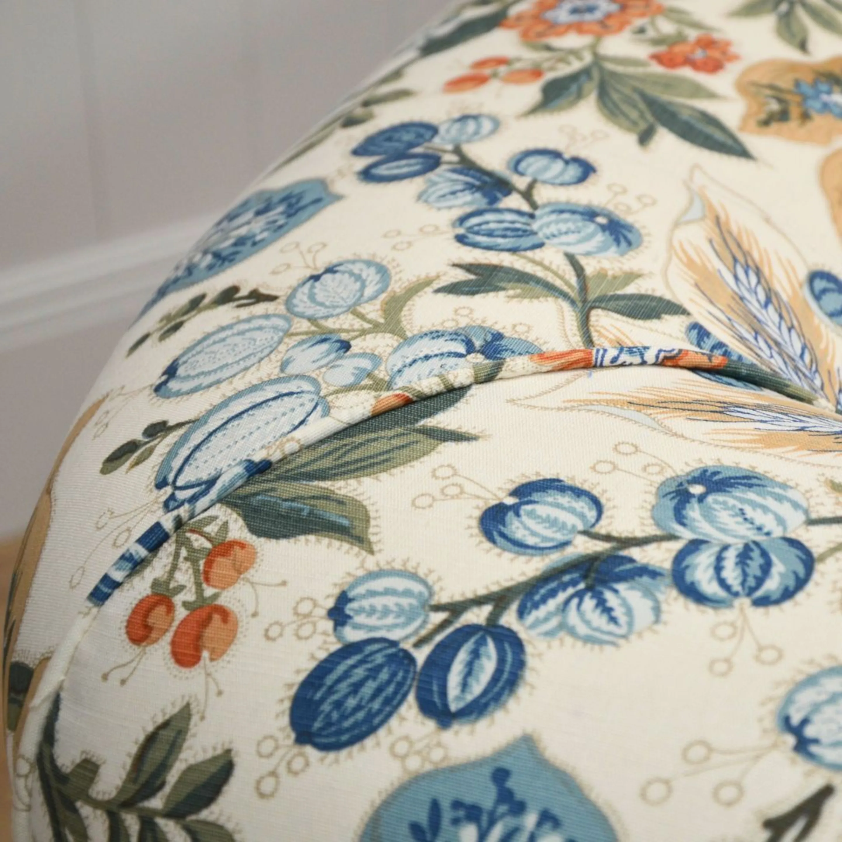 An elegant Chesterfield, reupholstered in a stunning printed linen. The soft hues and timeless design complement the classic shape of the sofa, creating a perfect blend of sophistication and comfort.