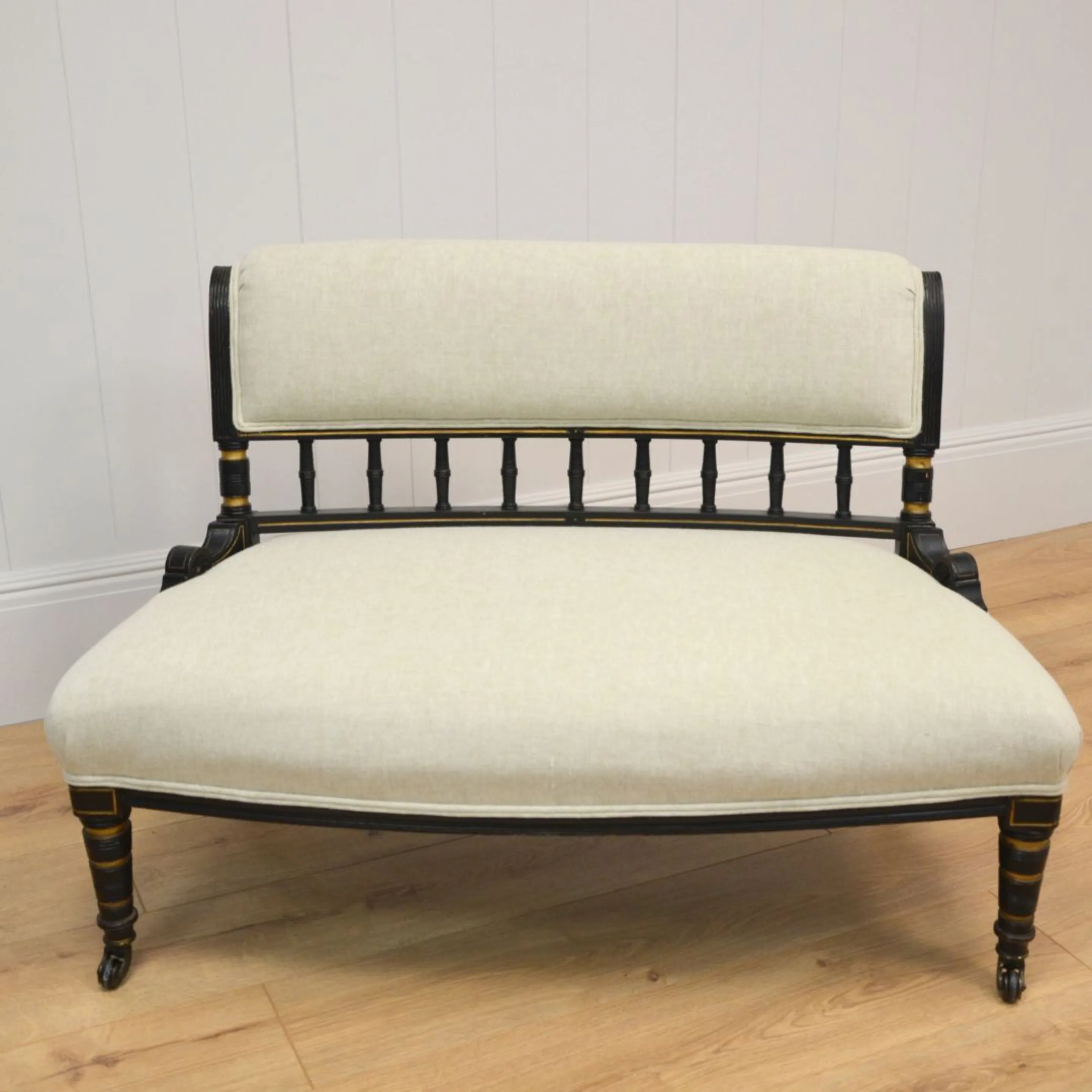 This antique piece has been recovered in a lovely cream linen. The natural tones and double piping accentuate the unique wooden details, resulting in a sophisticated and timeless piece that adds an elegant finish to any space.
