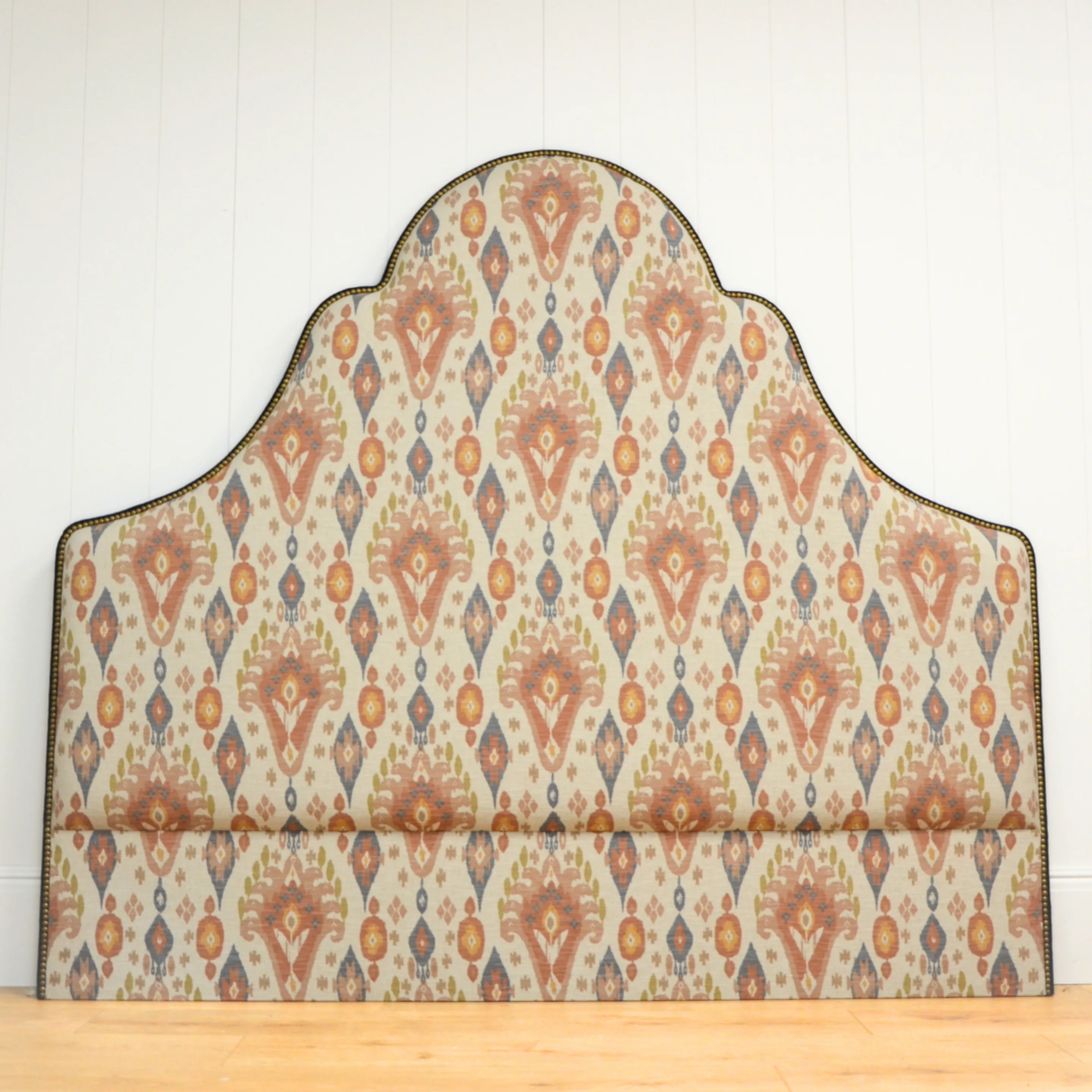 A stunning bespoke headboard, handcrafted in our workshop. A grand shape, with studding details tracing around the curves and corners, bought to life against the dark velvet border.