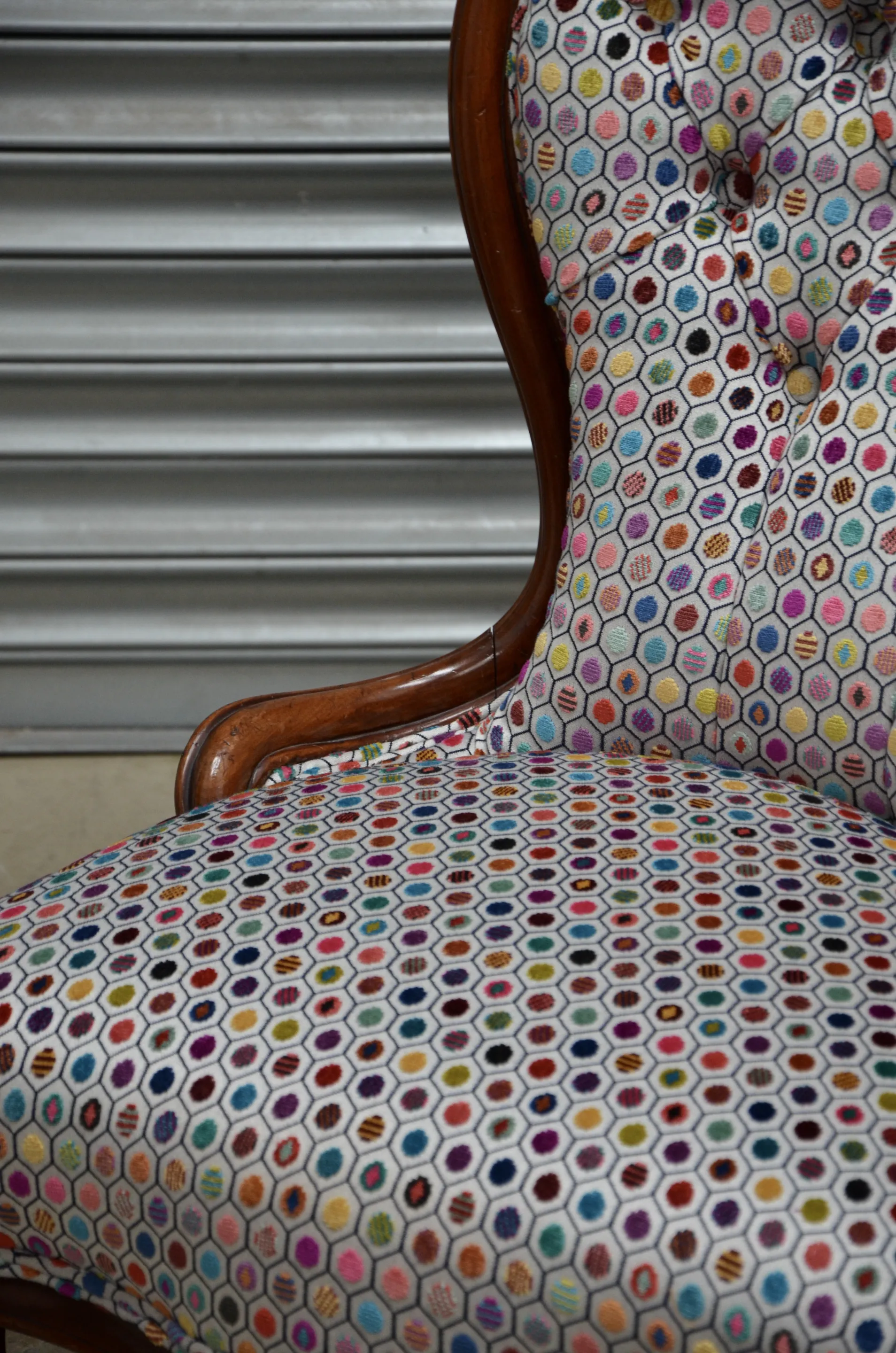 Stripped and recovered with a stunning cut velvet from Osborne and Little. Double-piped finish with matching buttons.