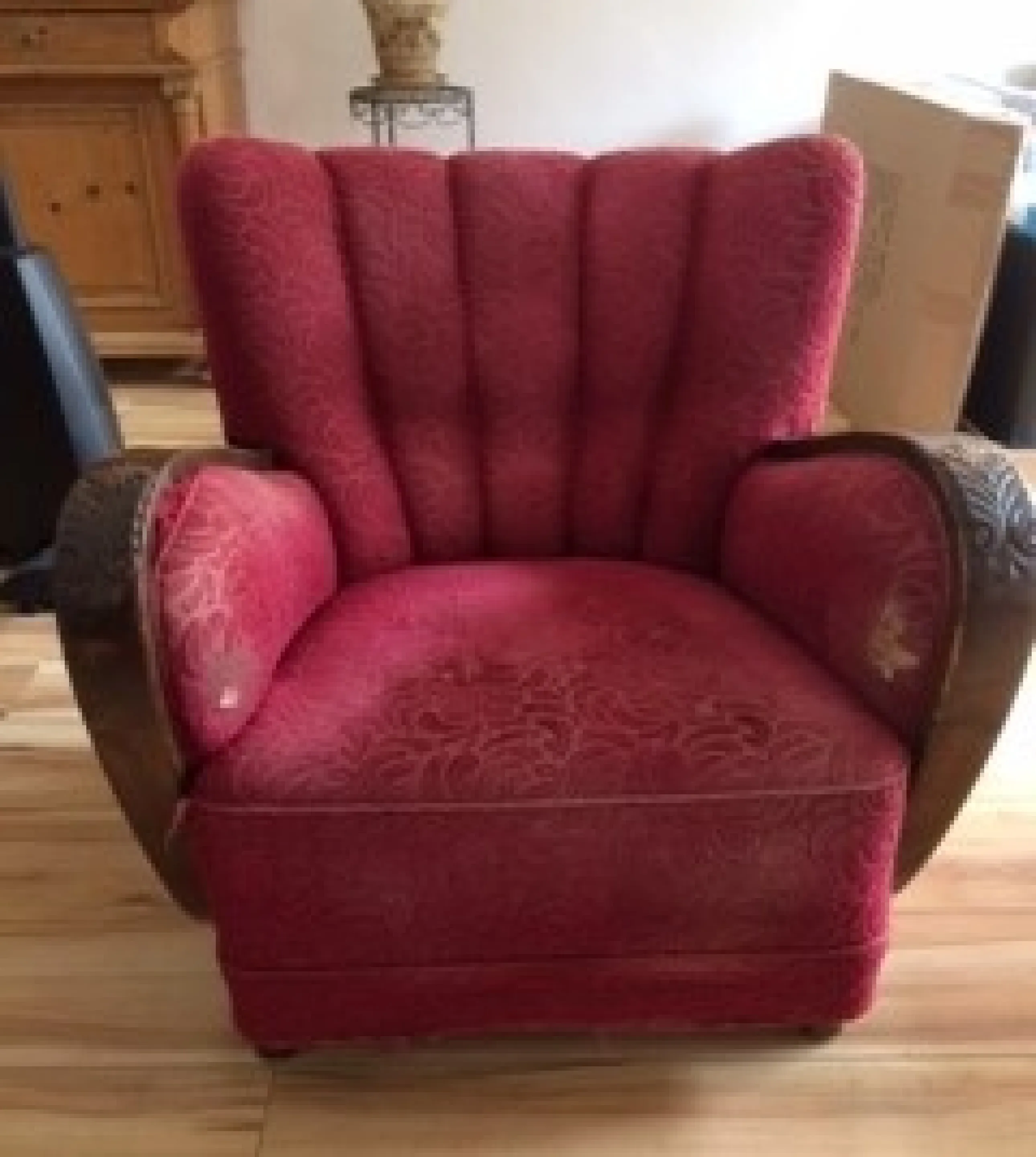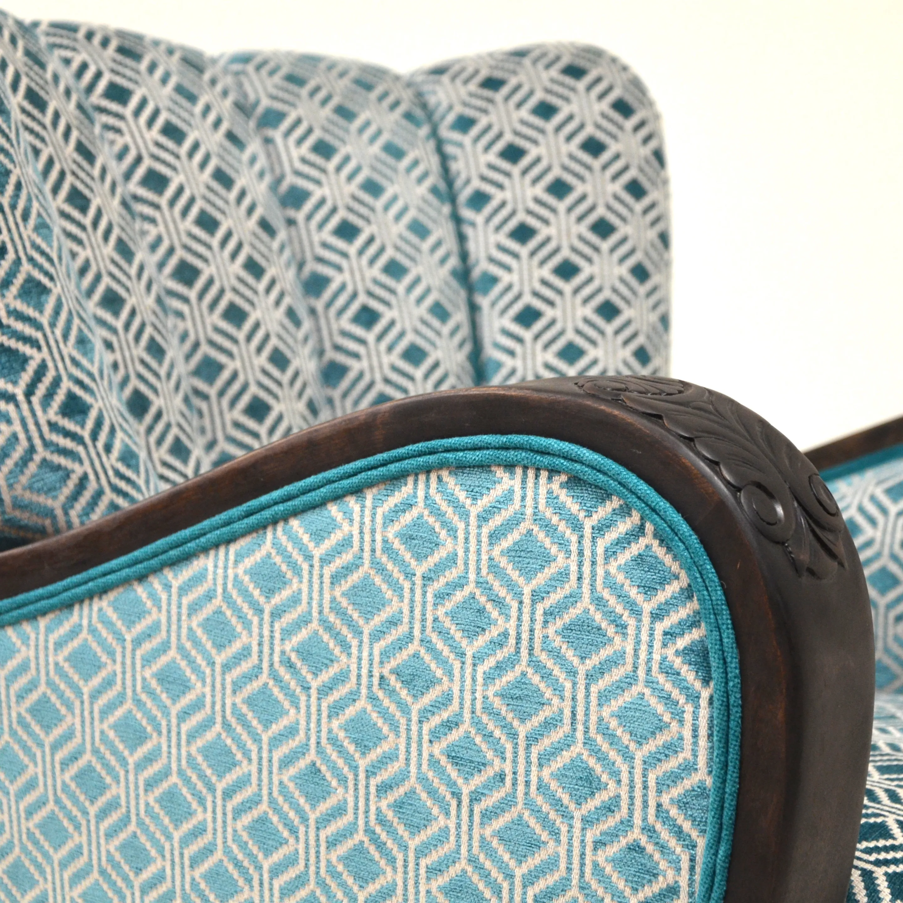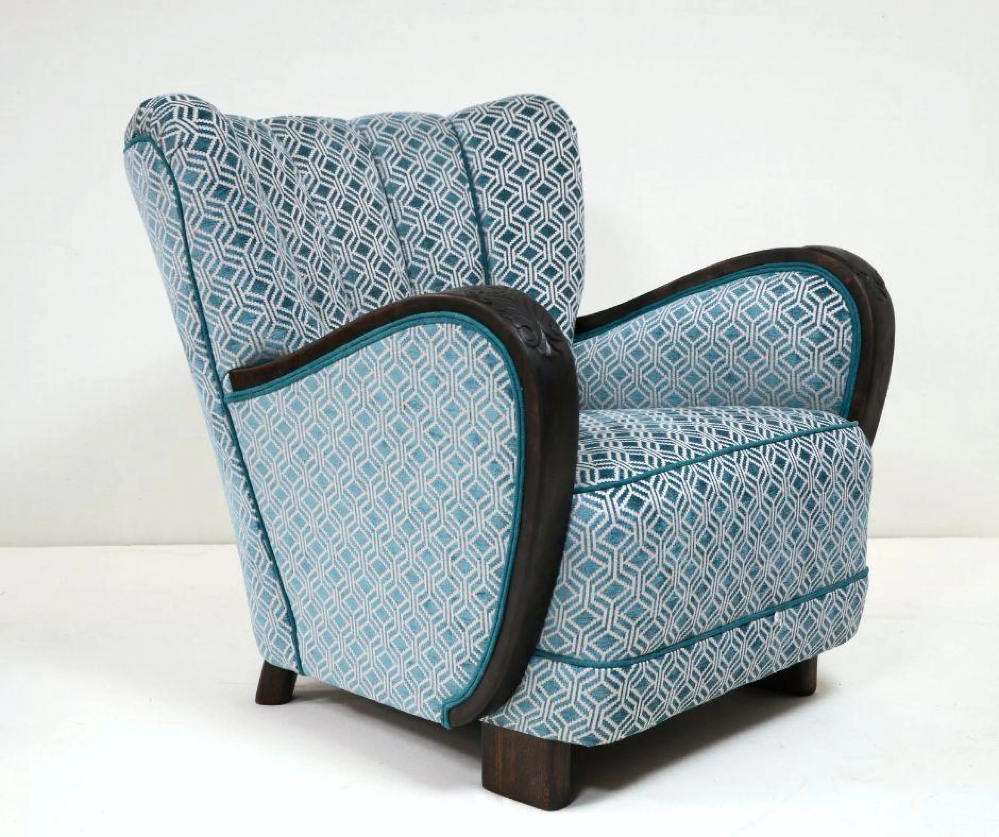 This fluted back chair, reupholstered with a geometric Romo fabric in ‘Kingfisher blue’, is heightened by the carved wooden details on the arms and double piping.