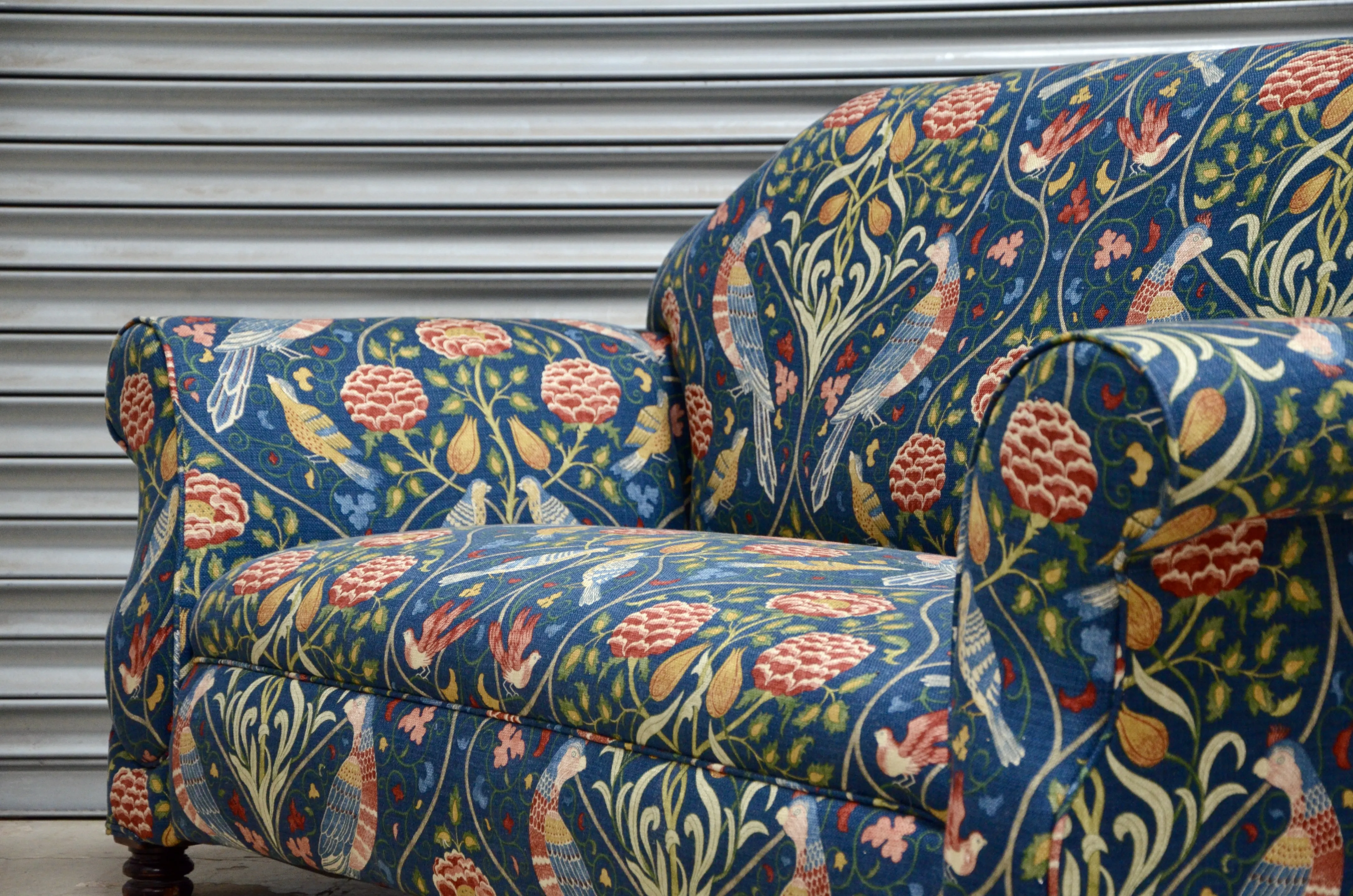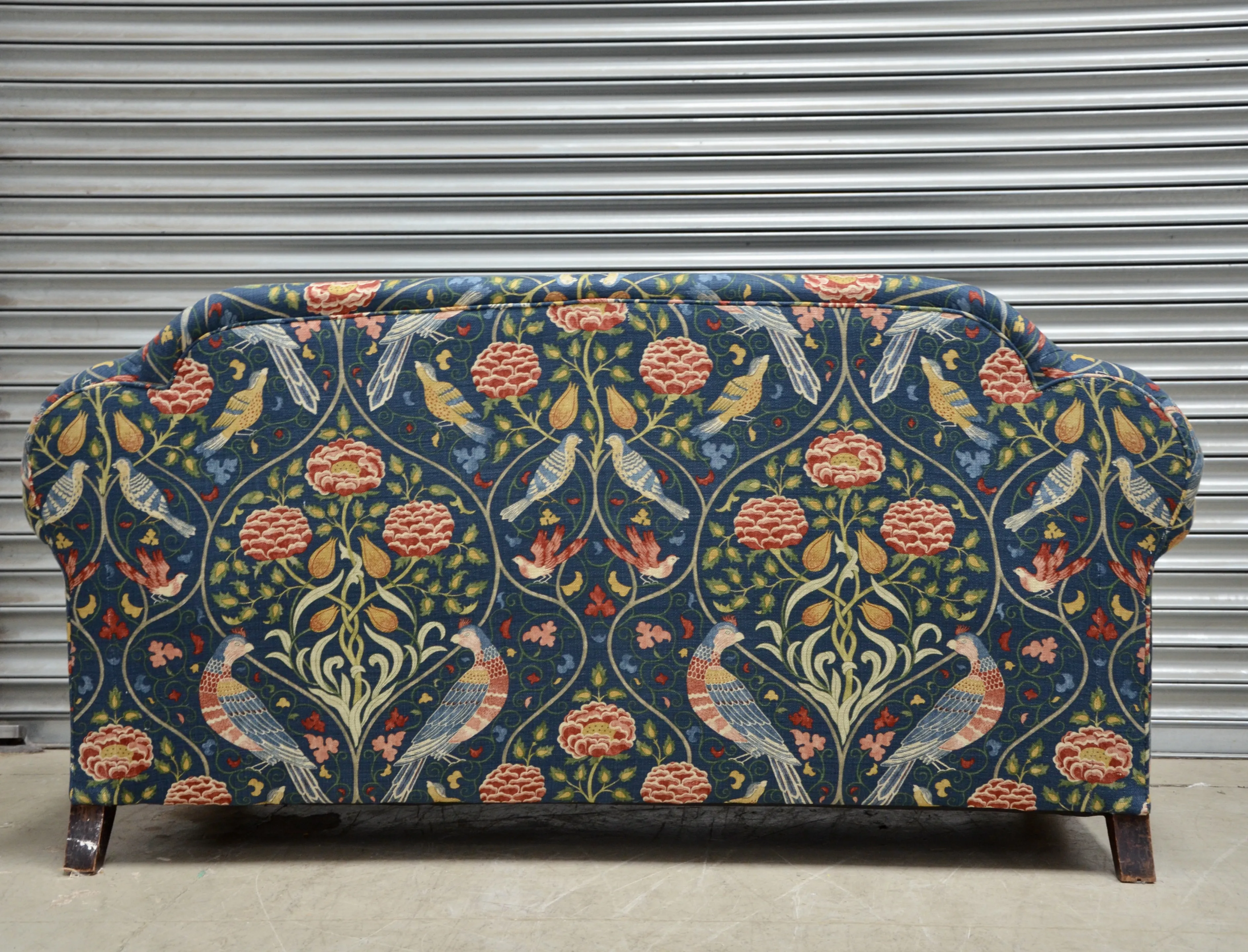 Stripped and fully reupholstered with all new foam and sundries. The new fabric is a stunning William Morris design, the sofa has been completely transformed. The fixed seat and back lends itself well to a detailed symmetrical patterned print acting as the canvas for the print to be seen and admired.