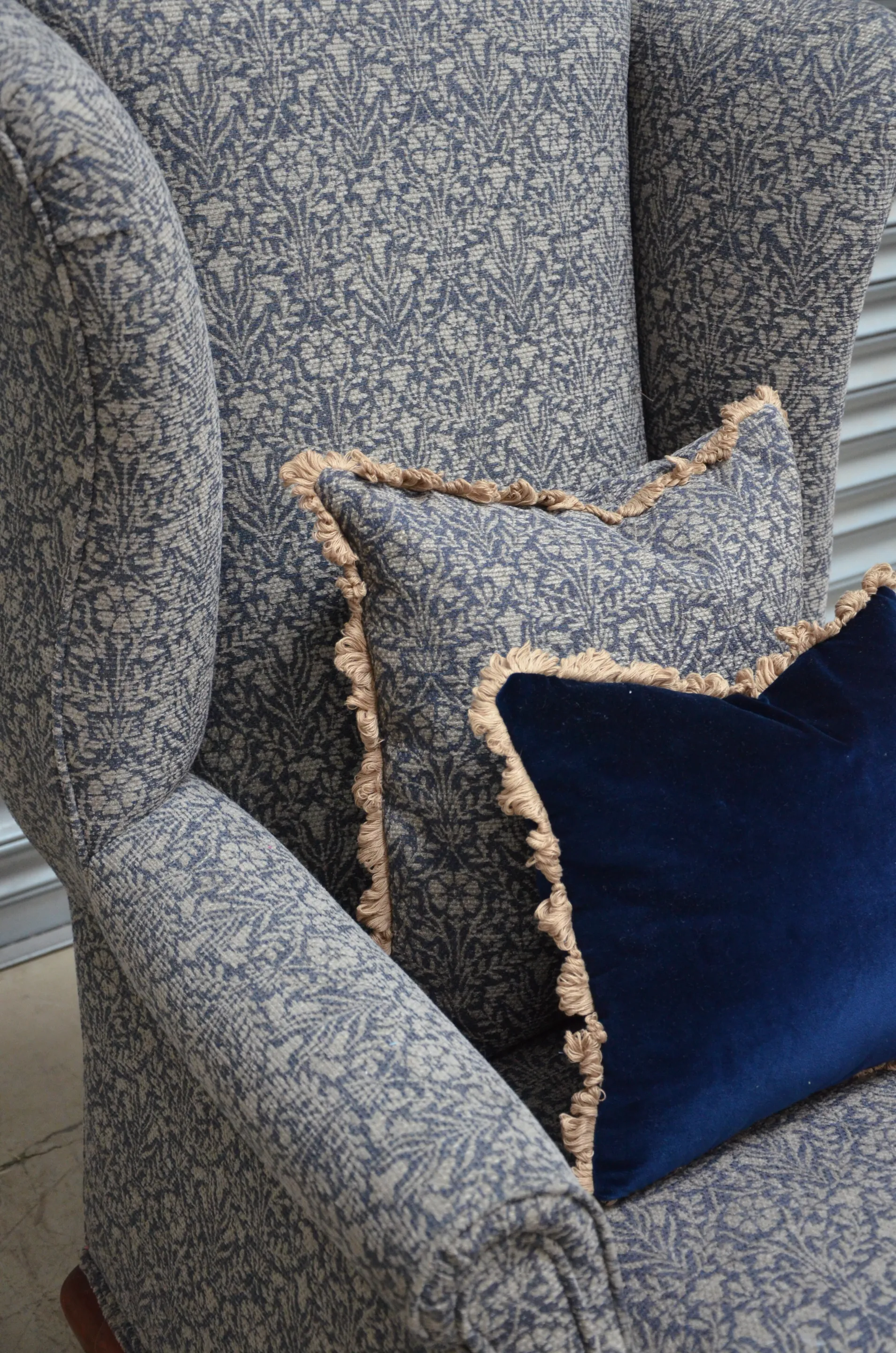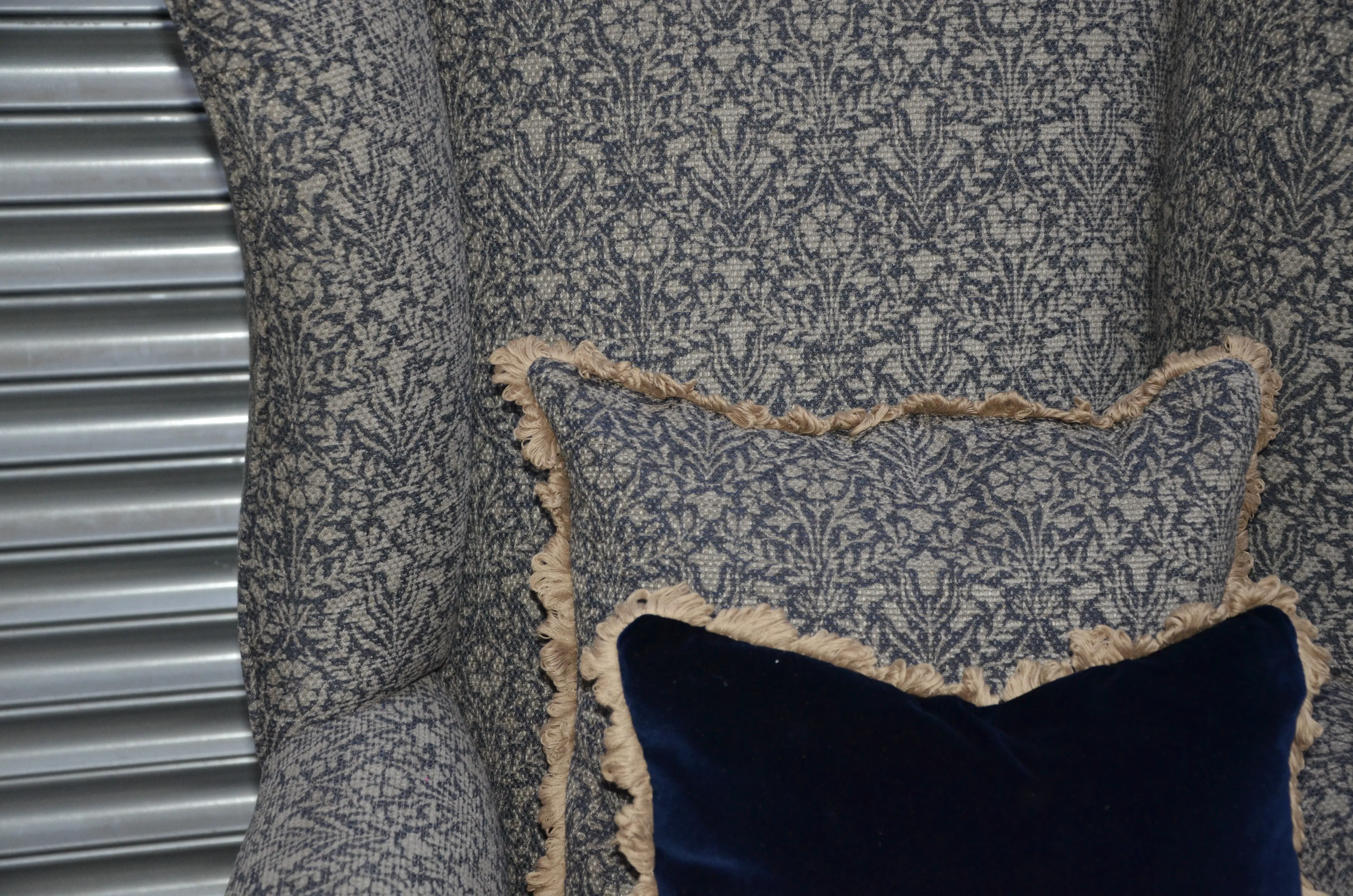 Stripped and recovered in a beautiful William Morris weave. We made the scatter cushion to complement the chair. The cushion is made up in a beautiful 100% cotton velvet from GP&J Baker with a decorative trim.