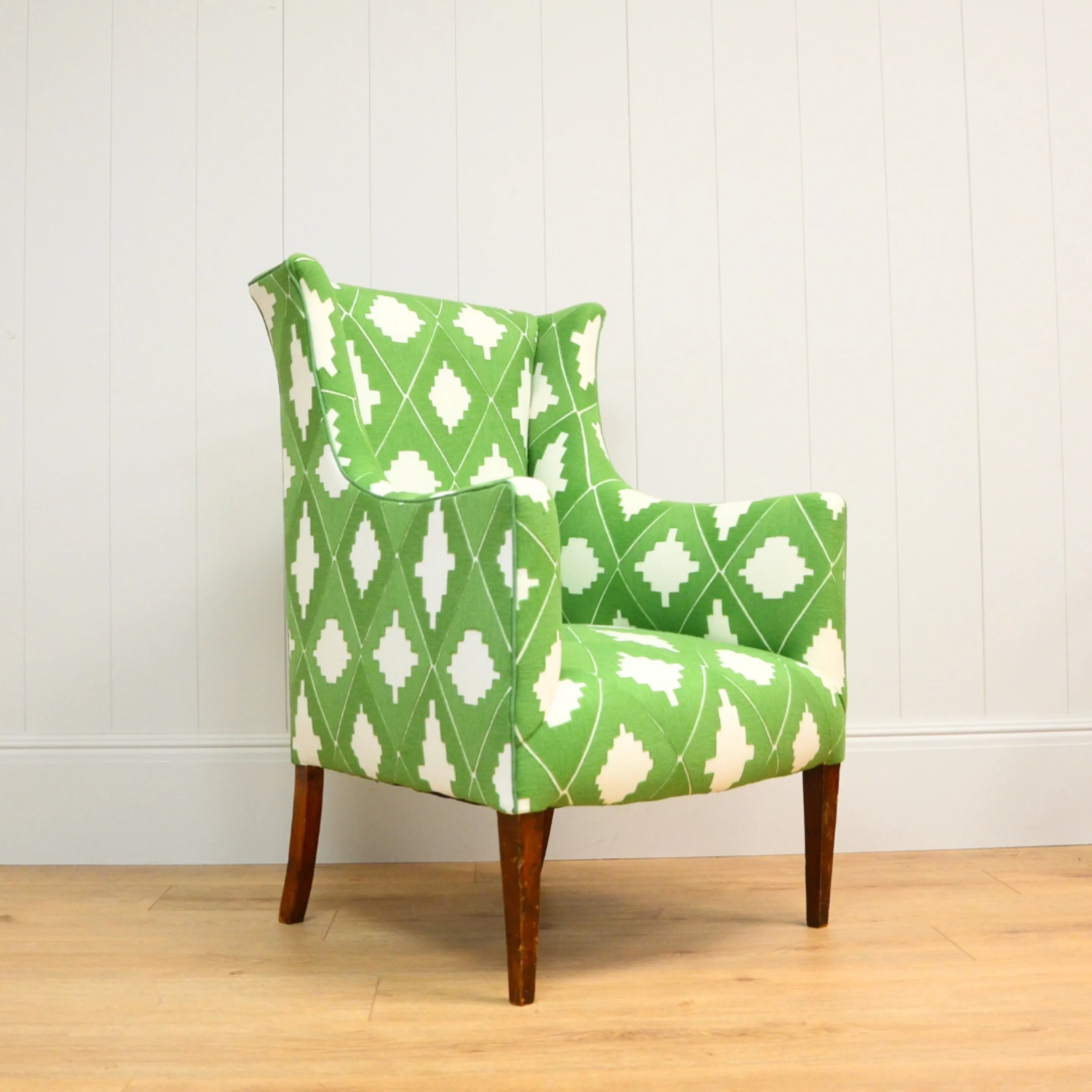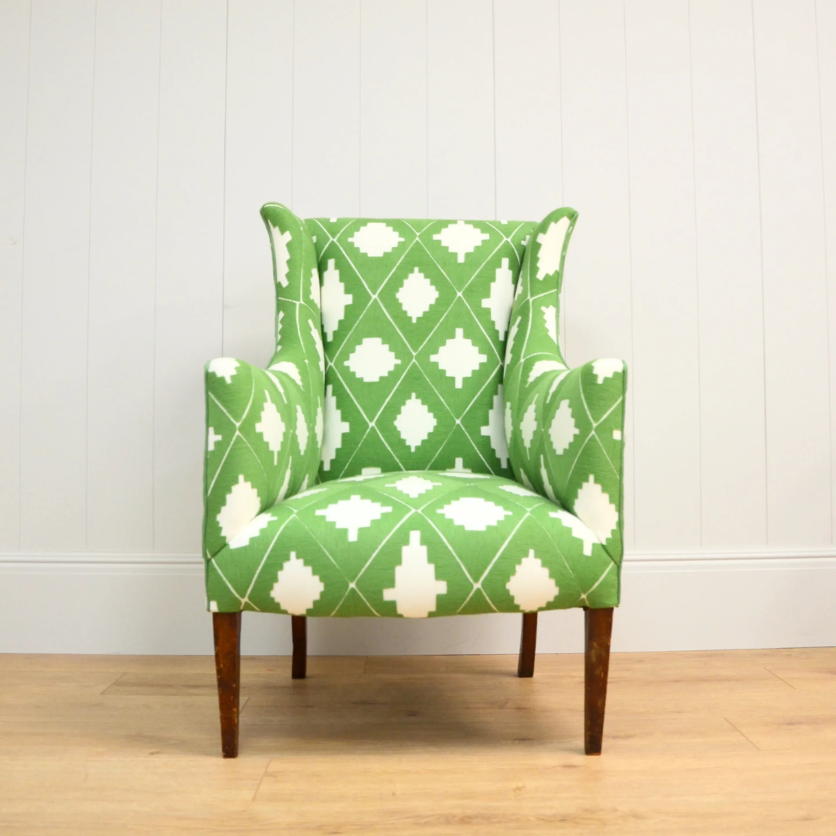 This stunning chair has been brought it to life with this green patterned fabric from Sanderson. We used a contrast piping to enhance the beautiful shape, tracing around the curves and corners. Swipe to see the before.