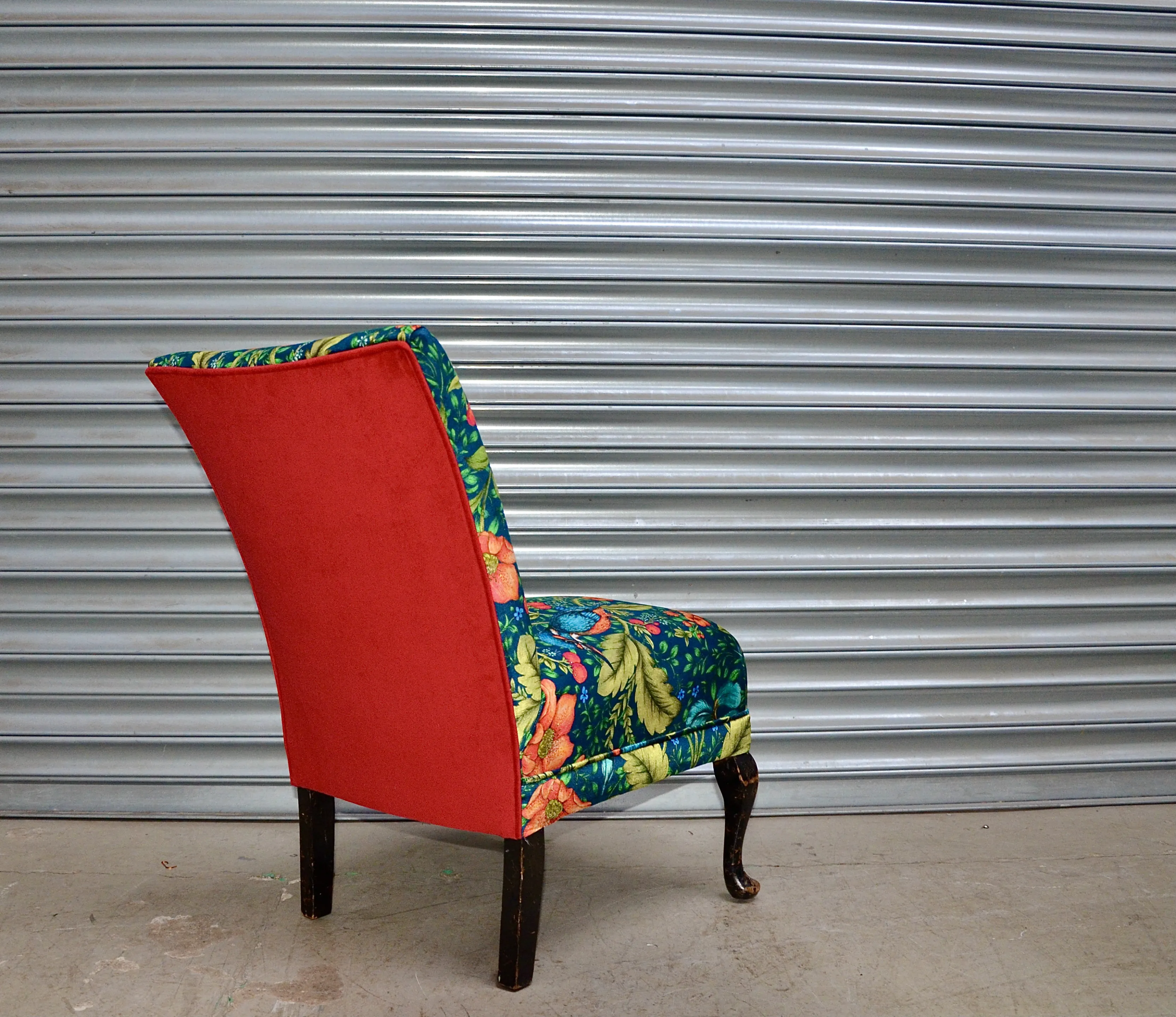 This little nursing chair has been completely re upholstered. All of the wooden joints have been tightened and a new spring unit fitted to make it a usable chair once again. As you can see our customer loves colour! The inside back and seat have been covered in Blendworth Rodbourn Paradise Blue which is composed of a natural blend of cotton and viscose creating the most beautiful, printed velvet fabric.