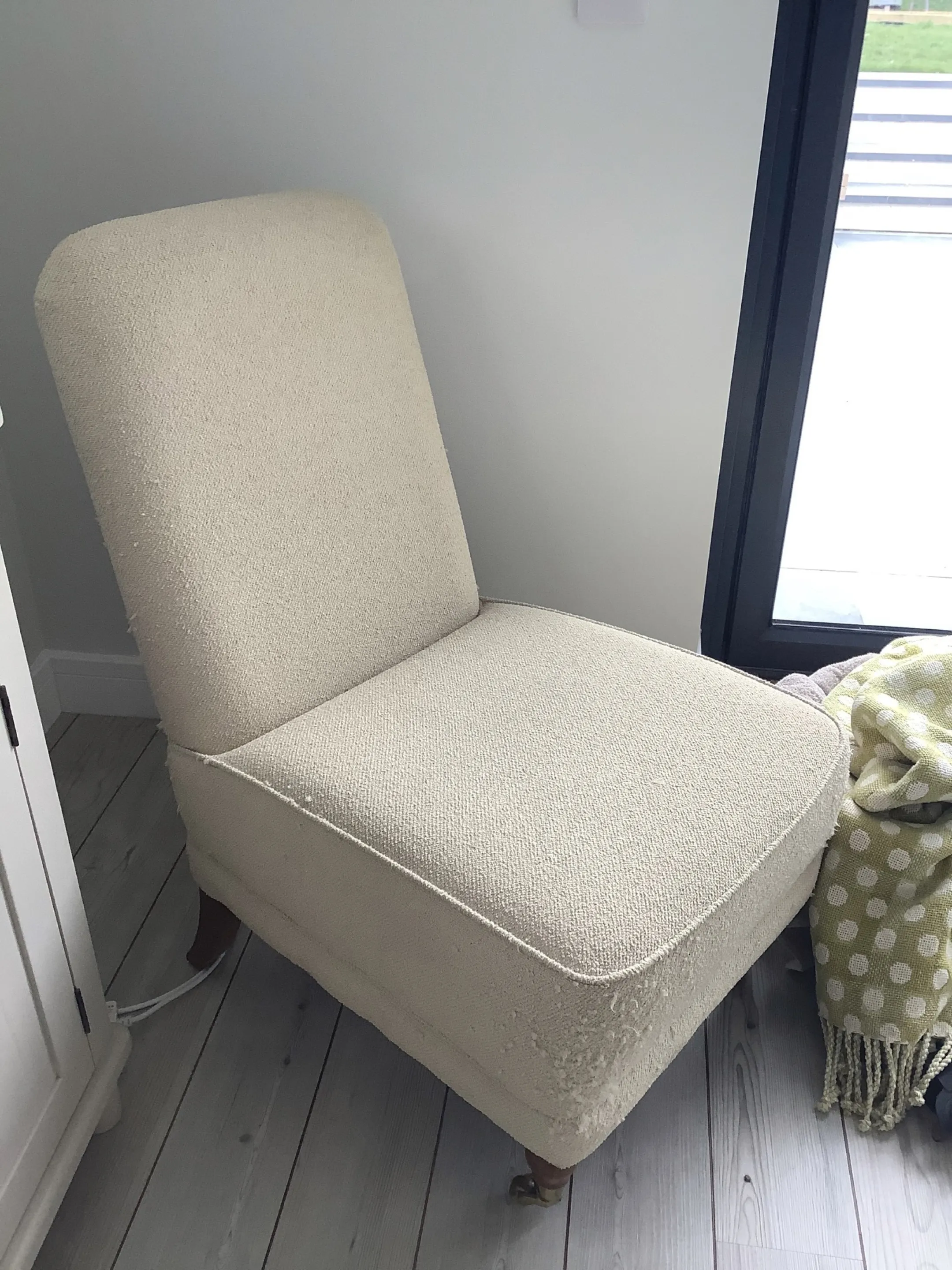 This small nursing chair has undergone a simple strip and recovery, structurally it was in good condition so all we needed to do was replace the original fabric. The print has been positioned down the centre back which complements the shape of the chair wonderfully.
