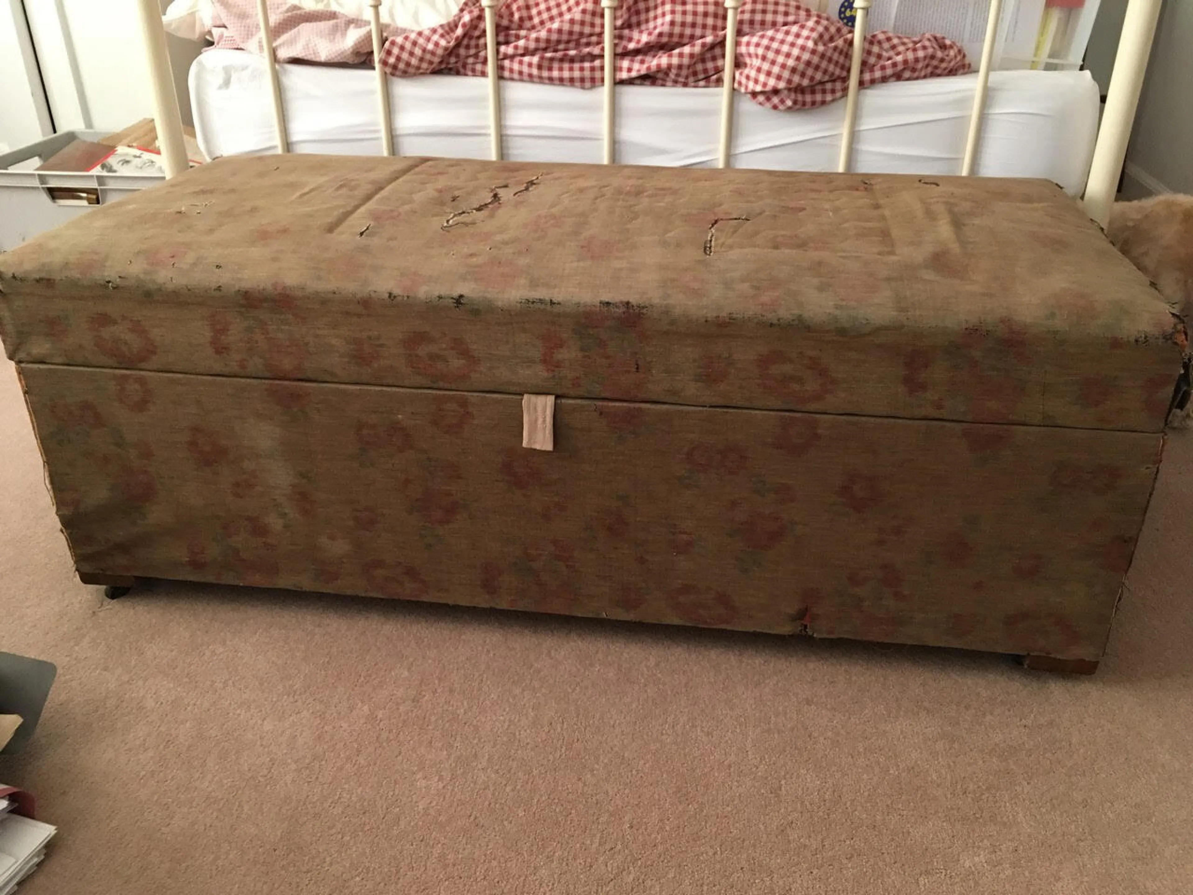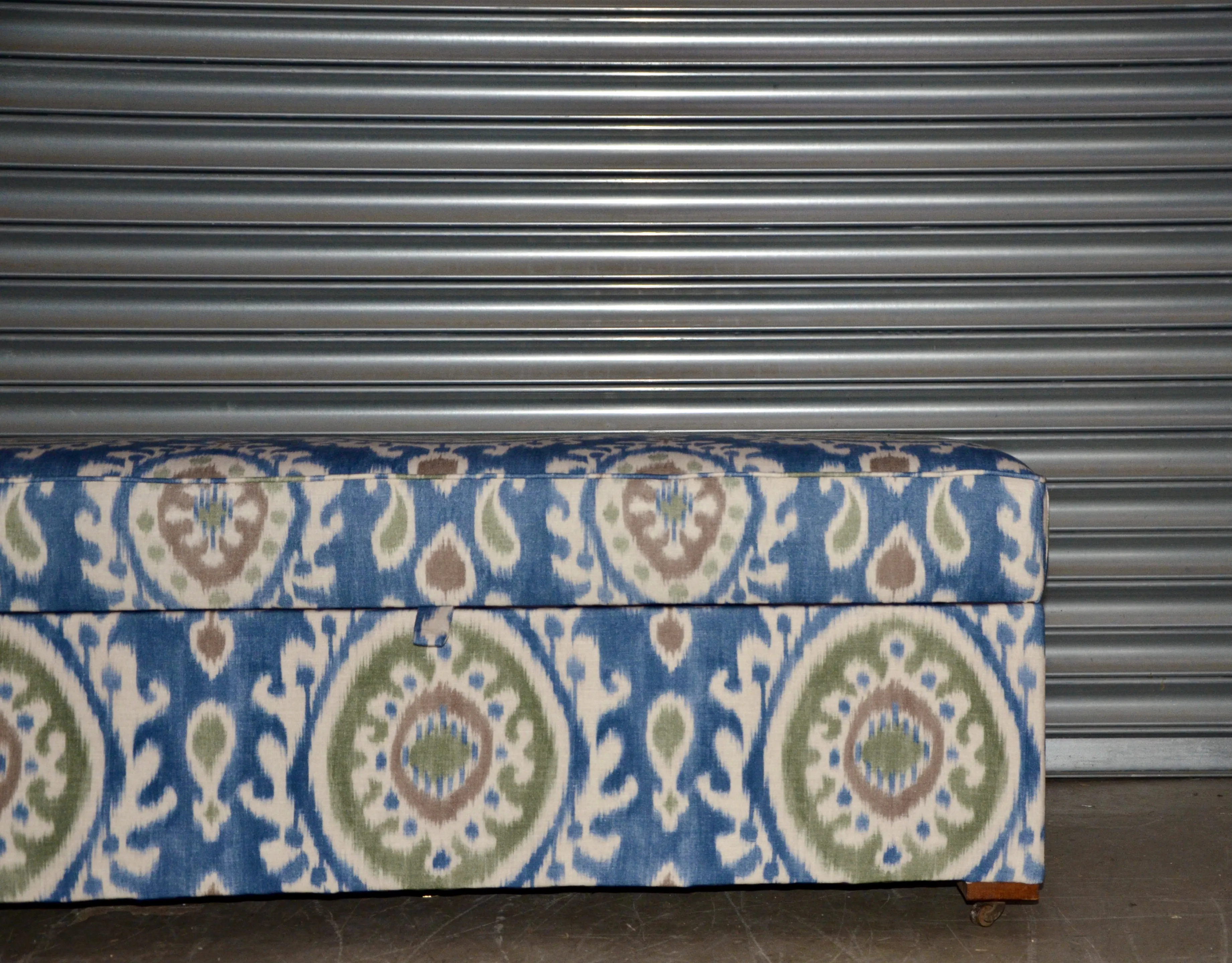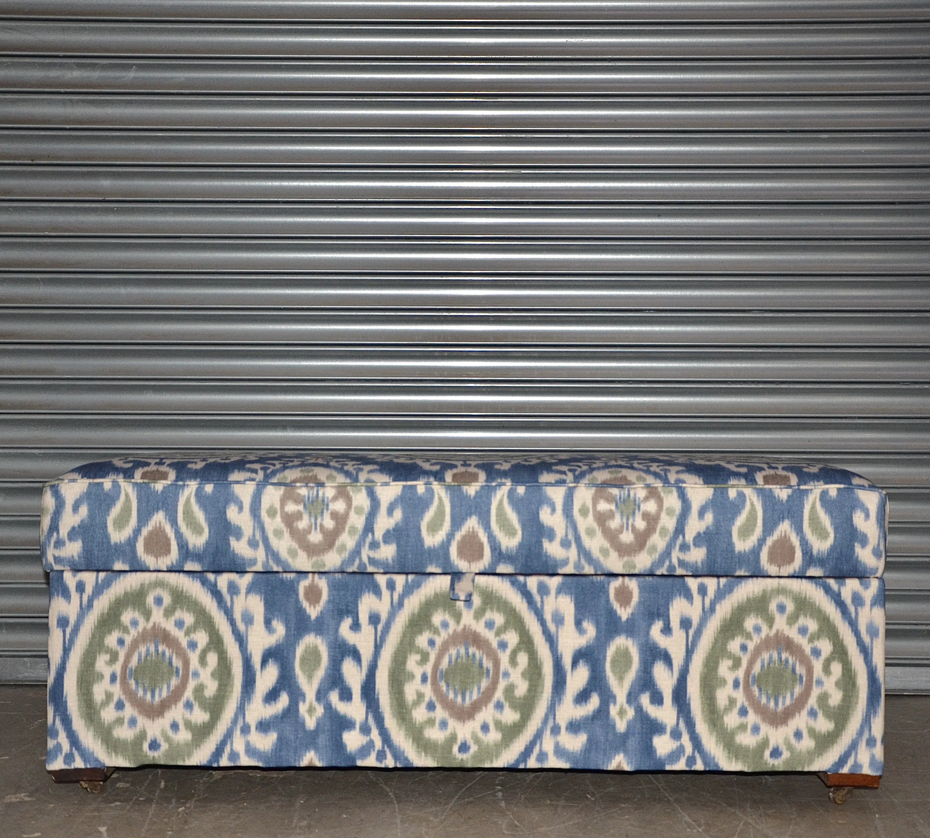 This ottoman was fully reupholstered inside and out. As well as the top and sides the internal lining also needed replacing. The Madina Fabric by Manuel Canovas complements the shape of the ottoman beautifully, allowing the pattern to be fully appreciated. The Ikat design is based on an antique Uzbekistan silk coat and printed on a soft linen background.