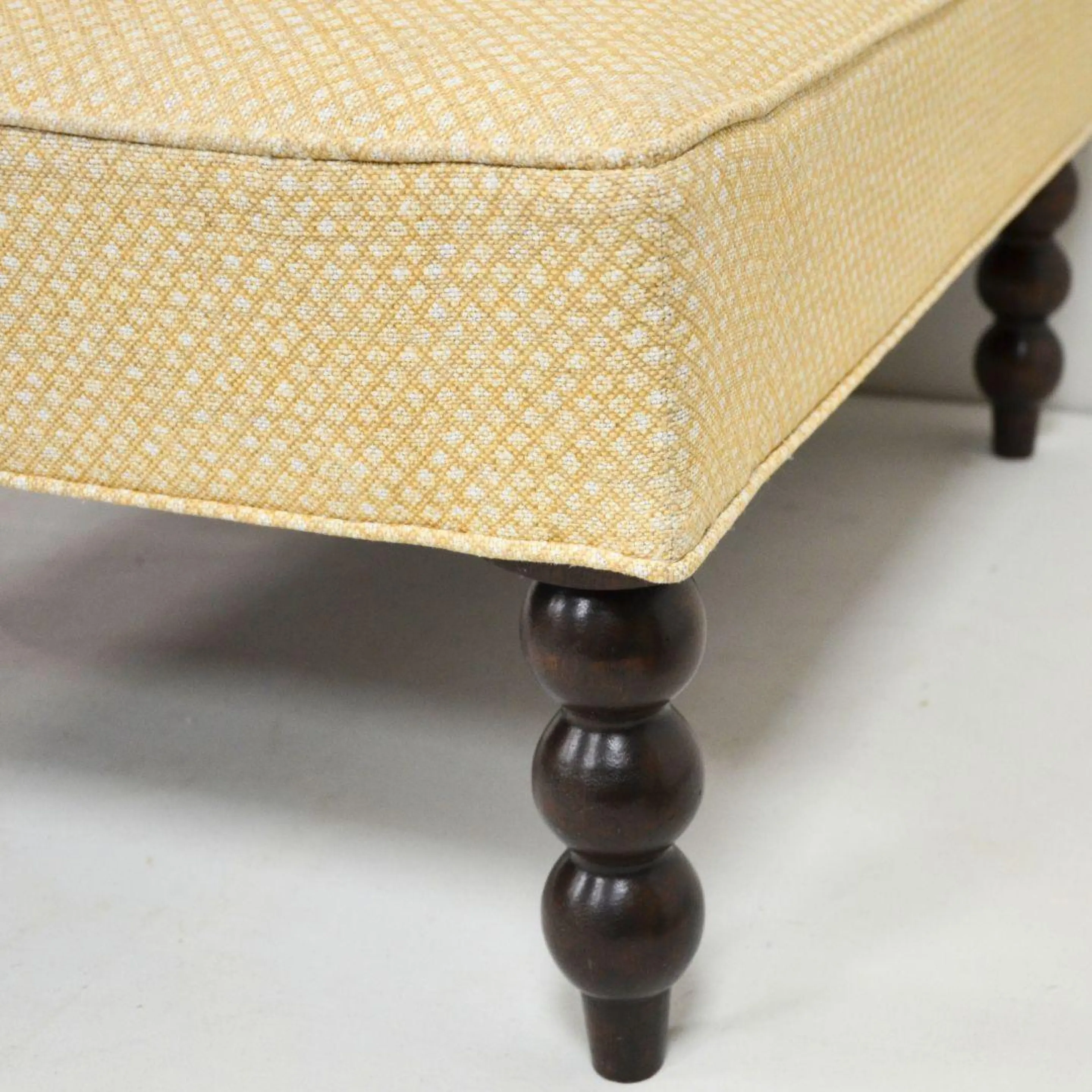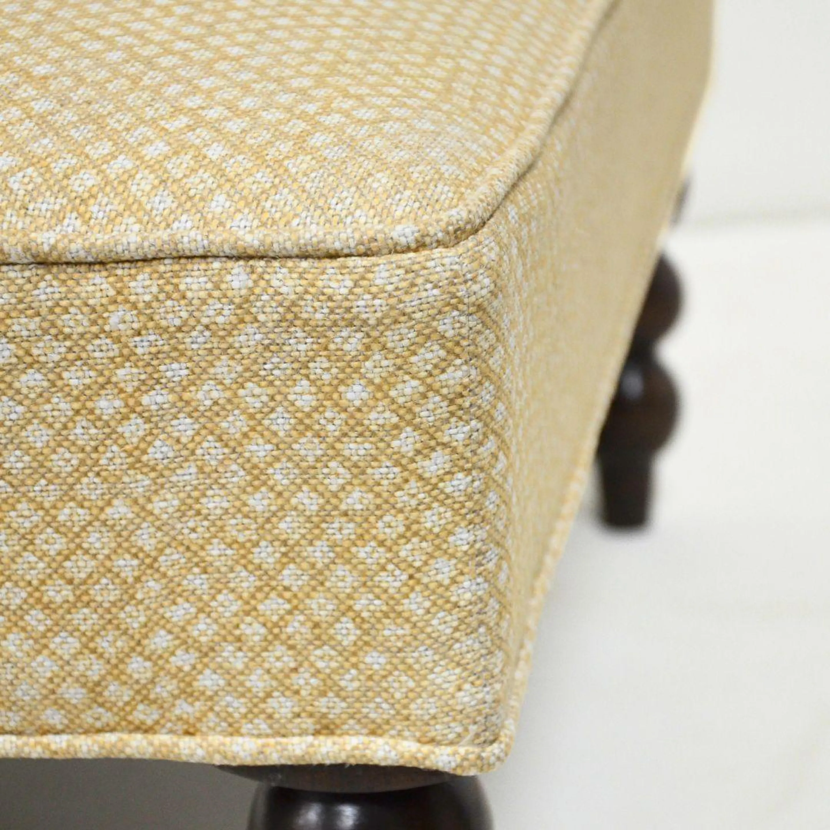 Ottoman with Carved Wooden Legs Recovered in a Printed Fabric. The small scale, light yellow pattern complement the dark wooden legs perfectly, making this piece a great option for extra seating or to double up as a coffee table.