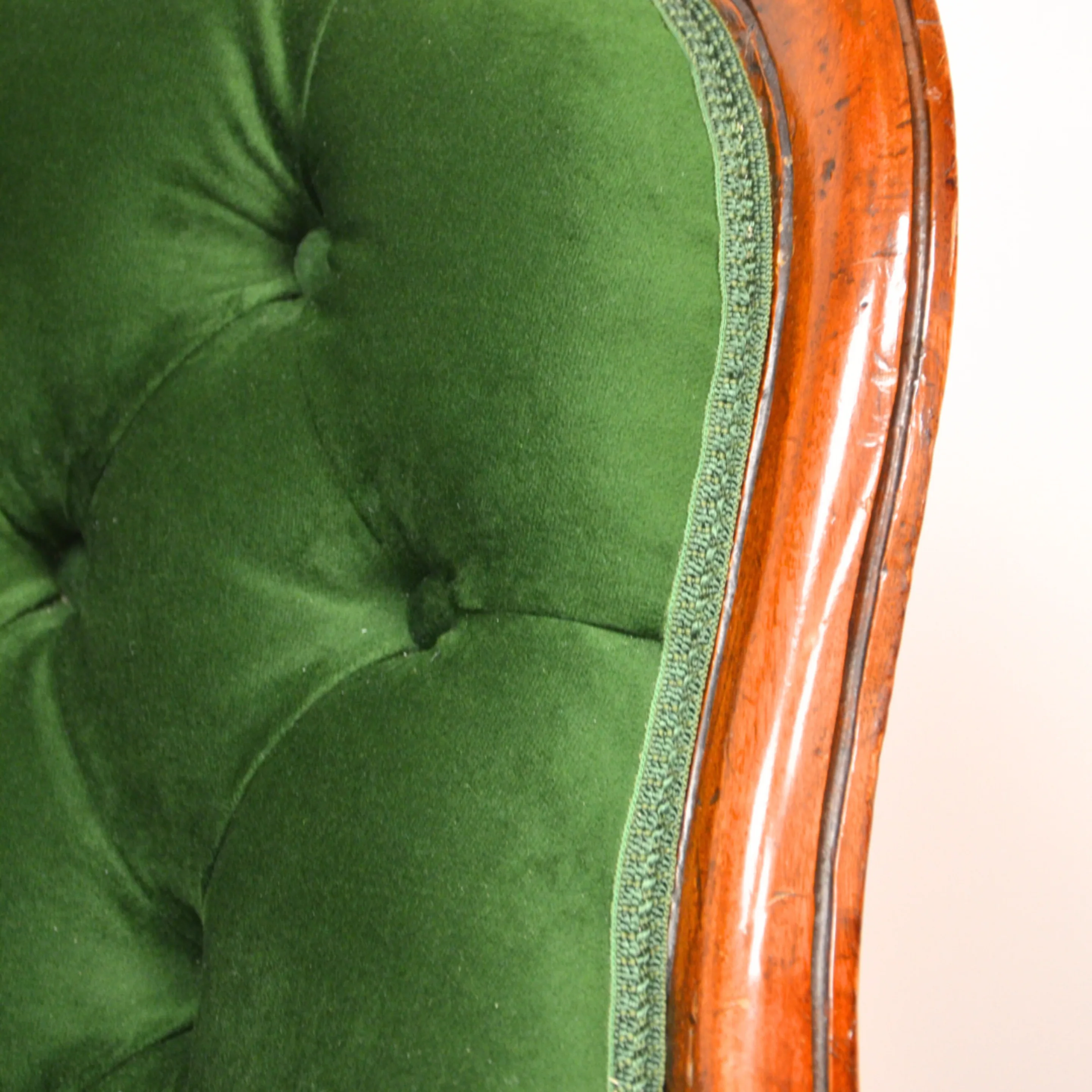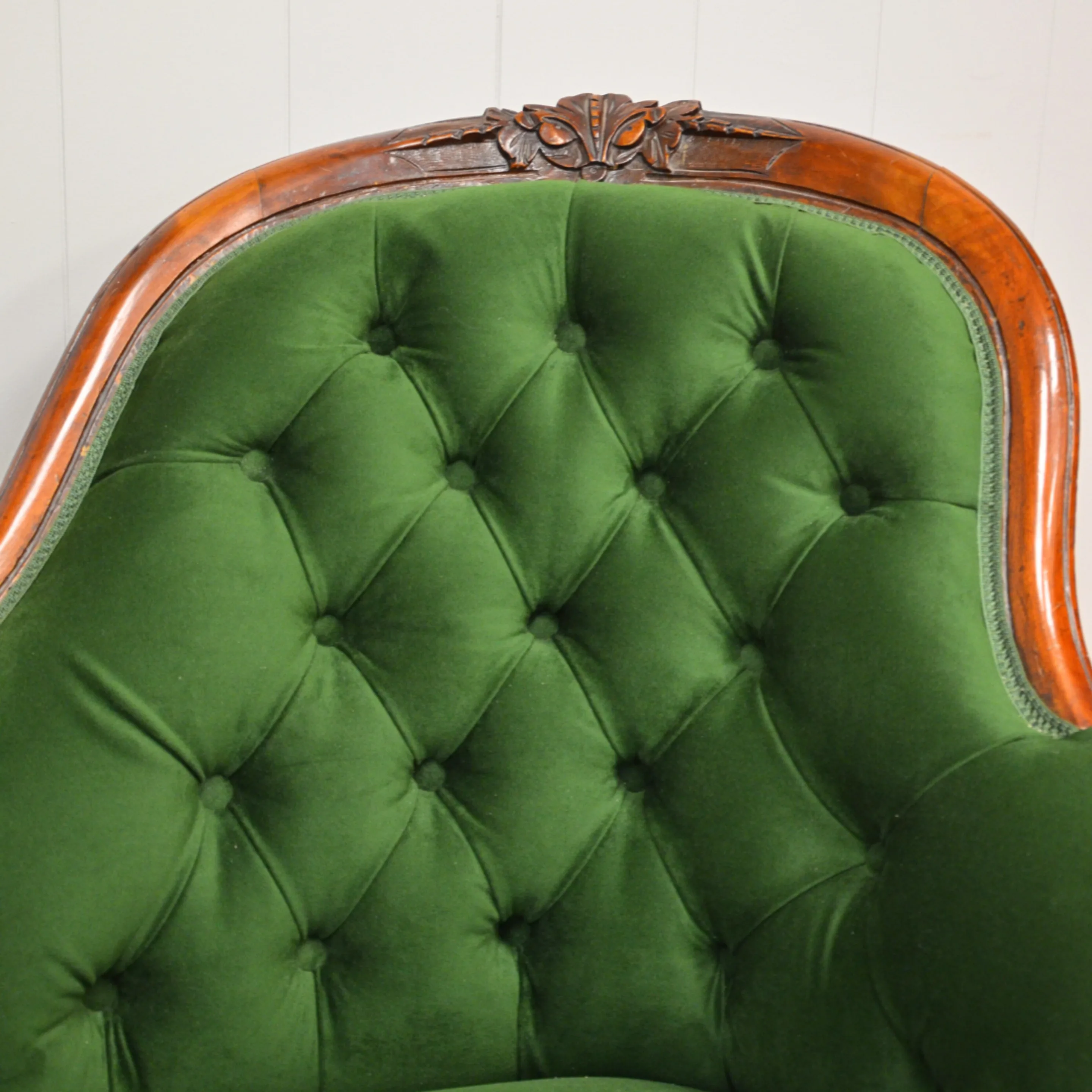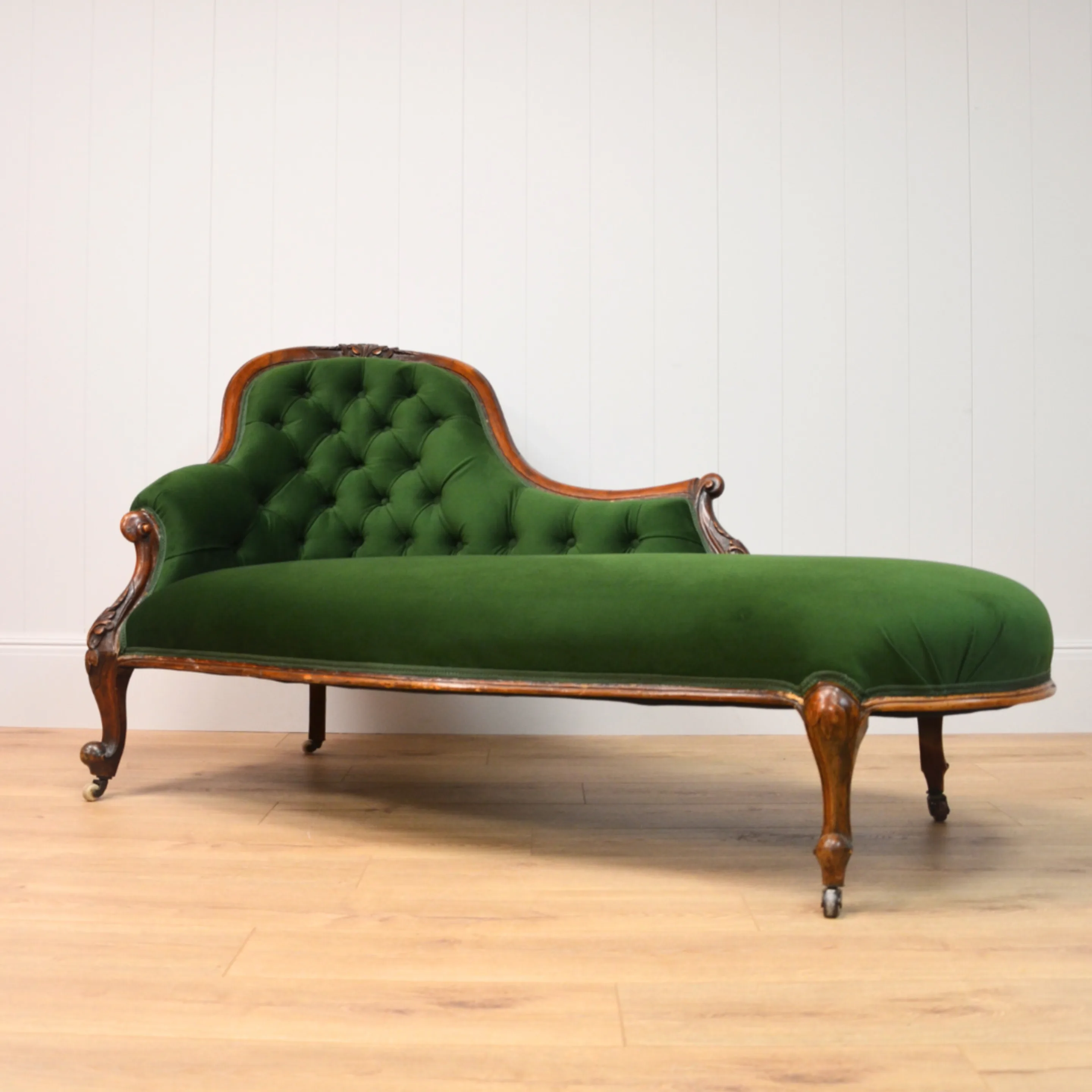 This antique chaise longue has been reupholstered in a luscious green velvet. It has been paired with a complementary gimp braid that wraps around its curves and corners to emphasize the beautiful shape.