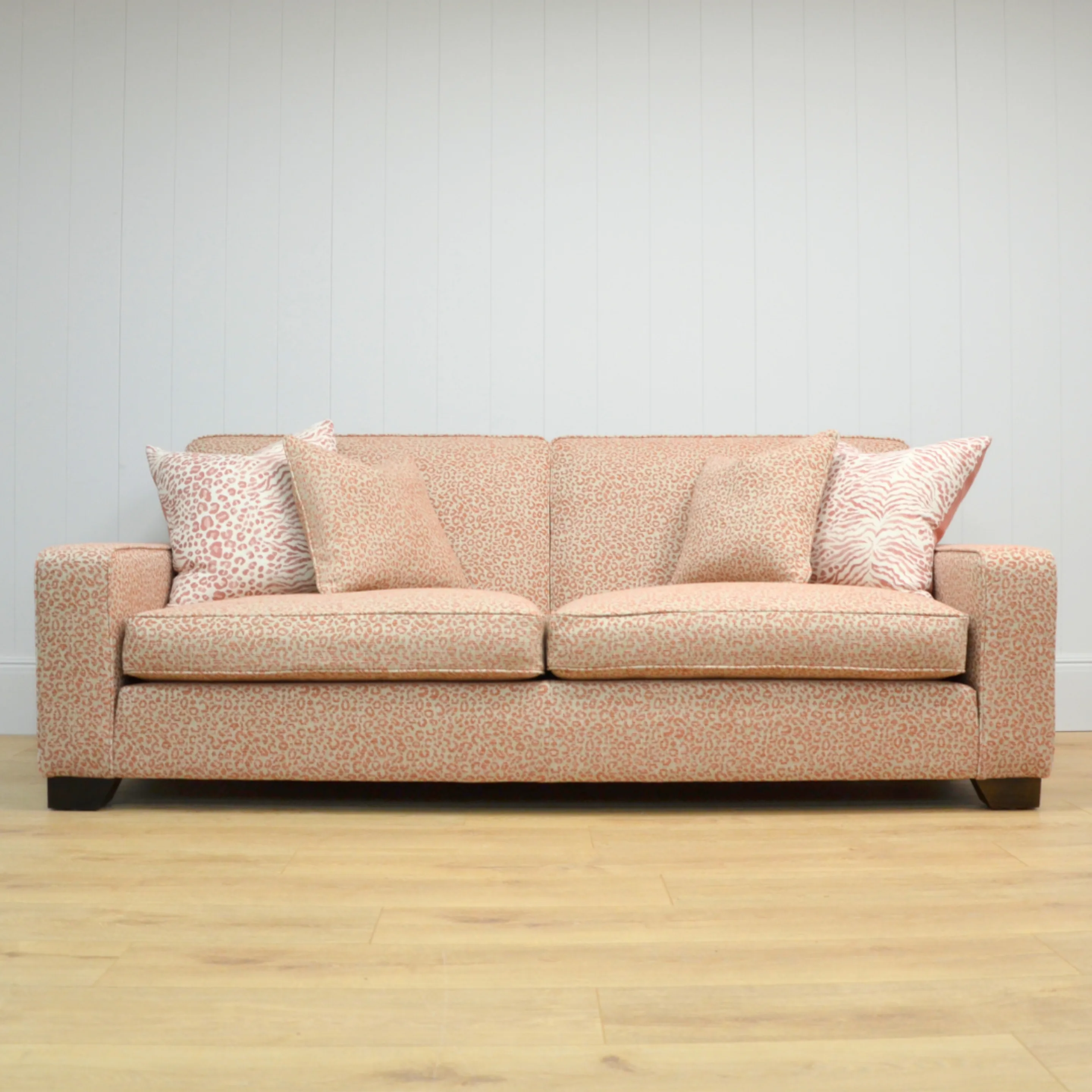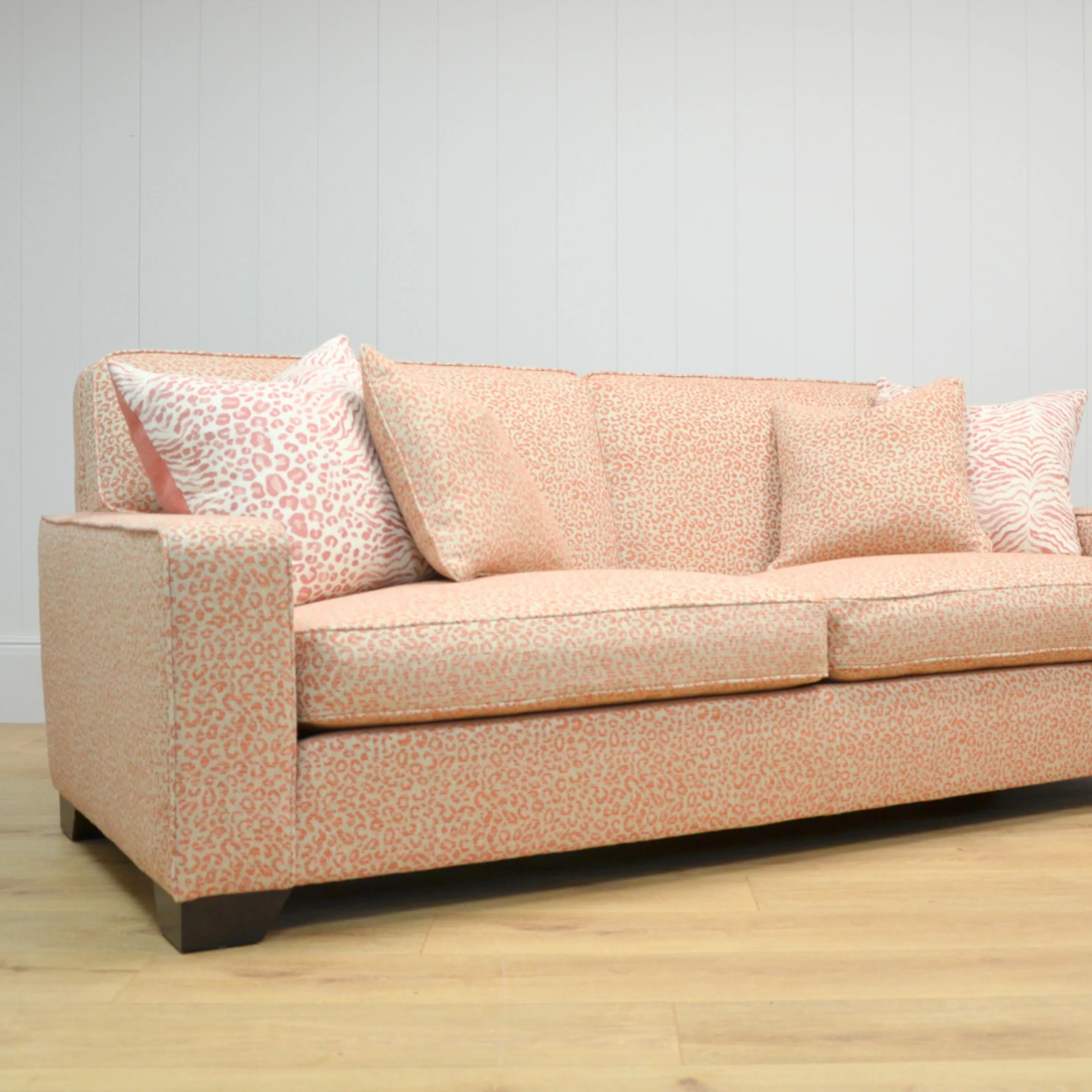 This woven leopard design from Colefax & Fowler works beautifully on this square arm sofa. The small scale pattern creates visual interest without being too overpowering working from close up and far away.