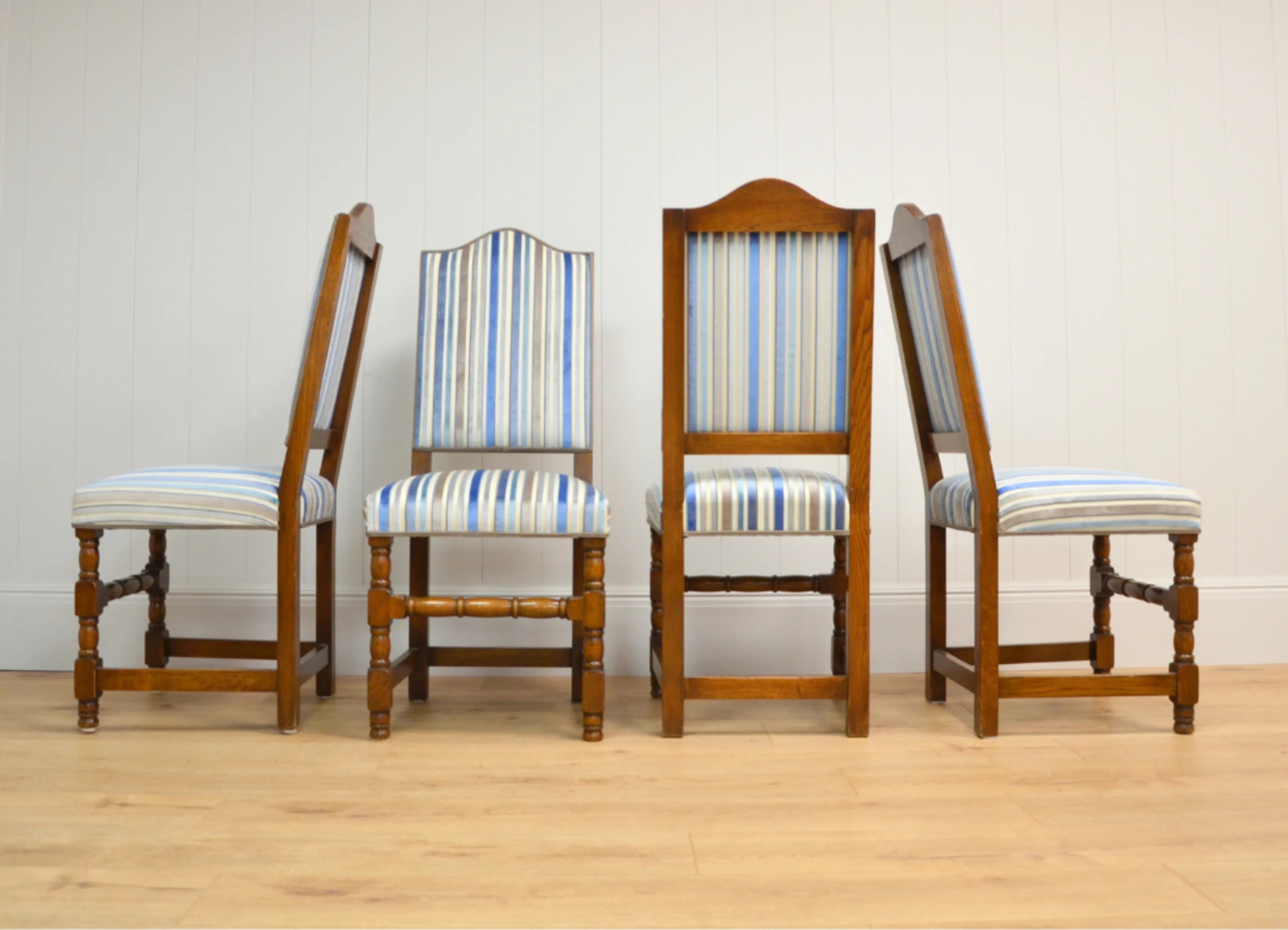These wonderful dining chairs have been upholstered in a striped cut velvet from fabric from Manuel Canovas, complimenting the original dark wooden frames. A grey piping wraps around the edges of the chairs creating a clean finish.