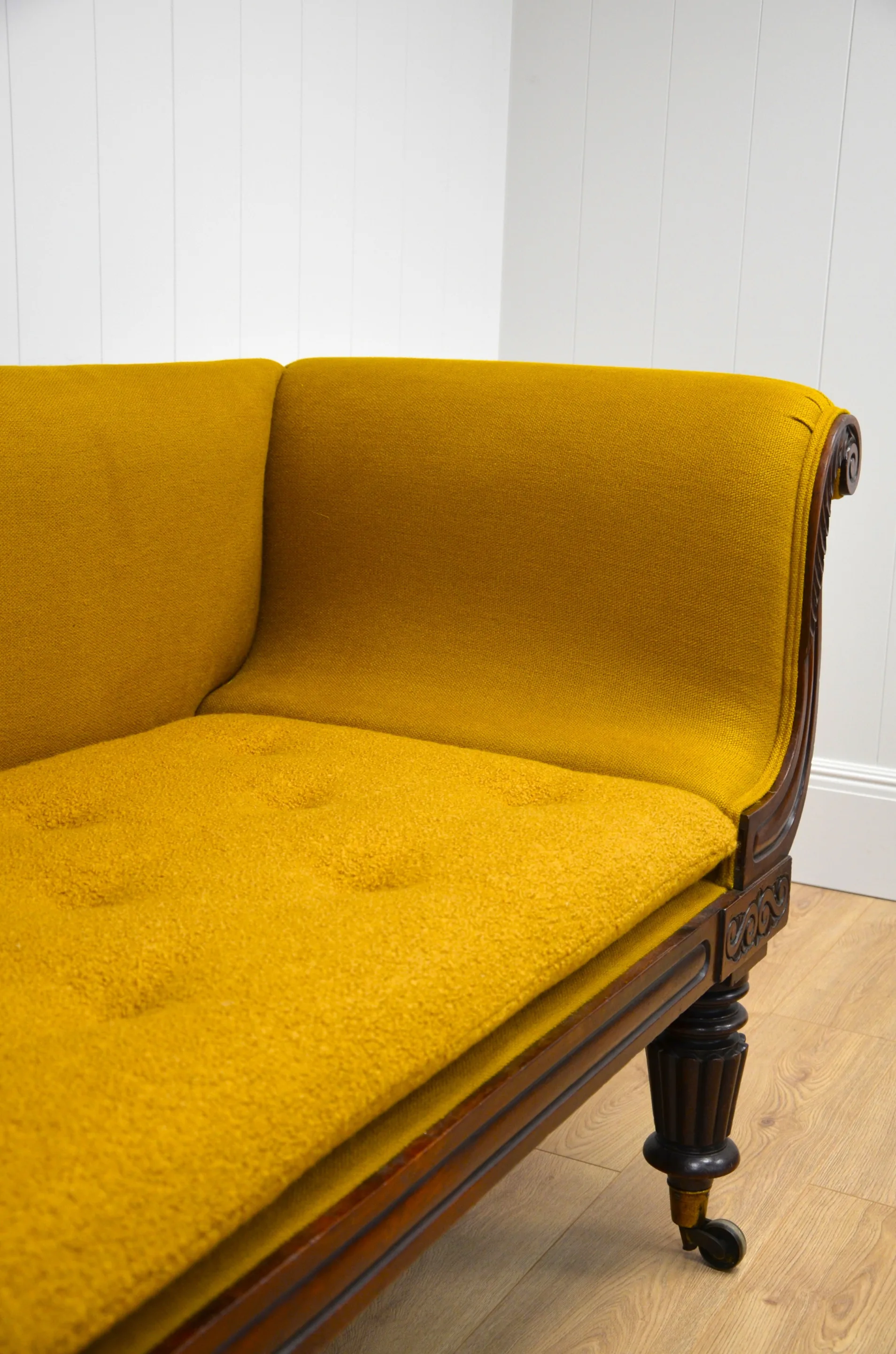 This stunning antique sofa has been reupholstered in a combination of mustard linen on the body, and a boiled wool boucle on the seat cushion. The beautiful colour compliments the dark wood frame beautifully.
