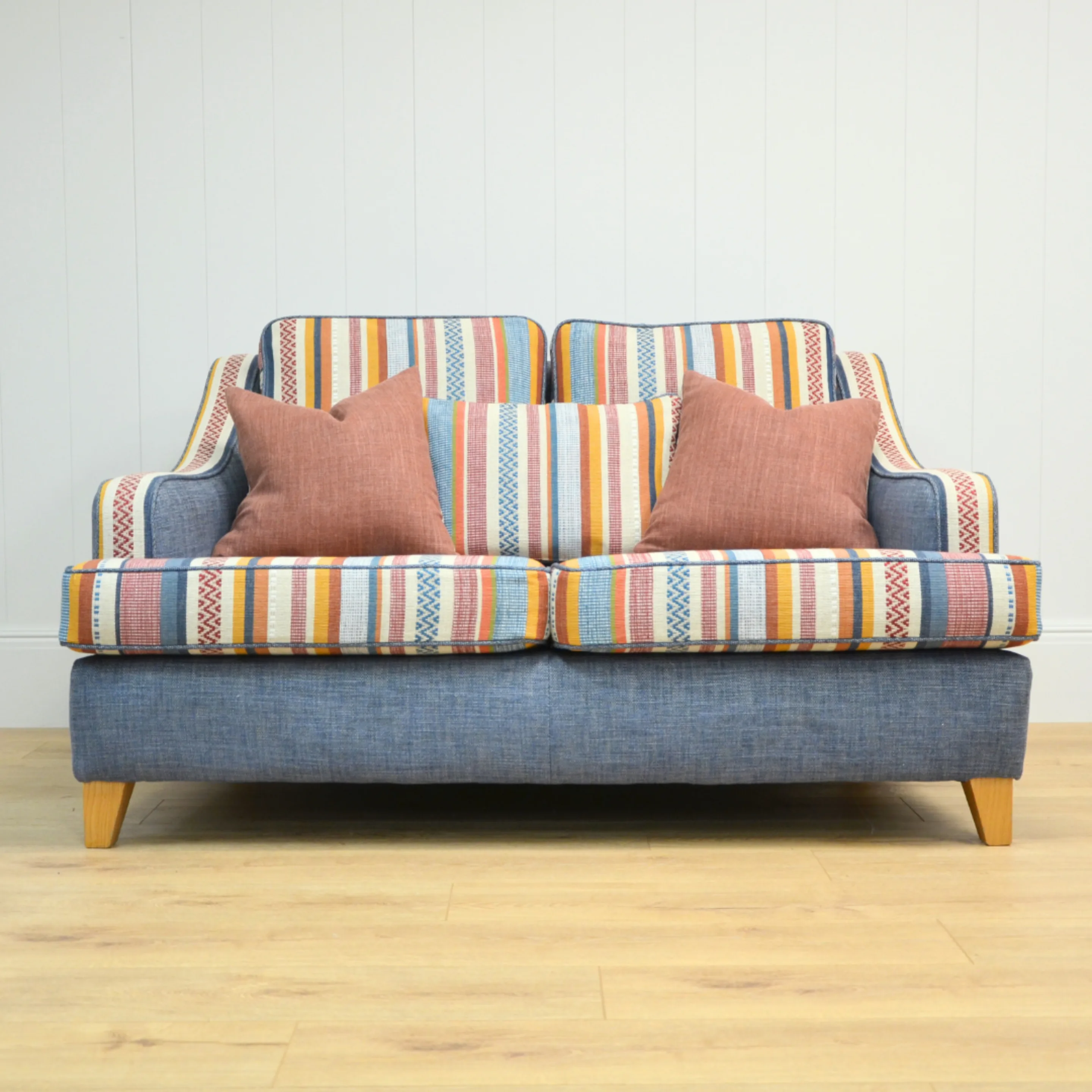 This sofa has undergone an amazing reupholstery transformation, using fabrics from Romo and Jane Churchill. The striped fabric runs perfectly down the arms of the sofa, giving it a playful touch, along with matching bespoke scatter cushions.