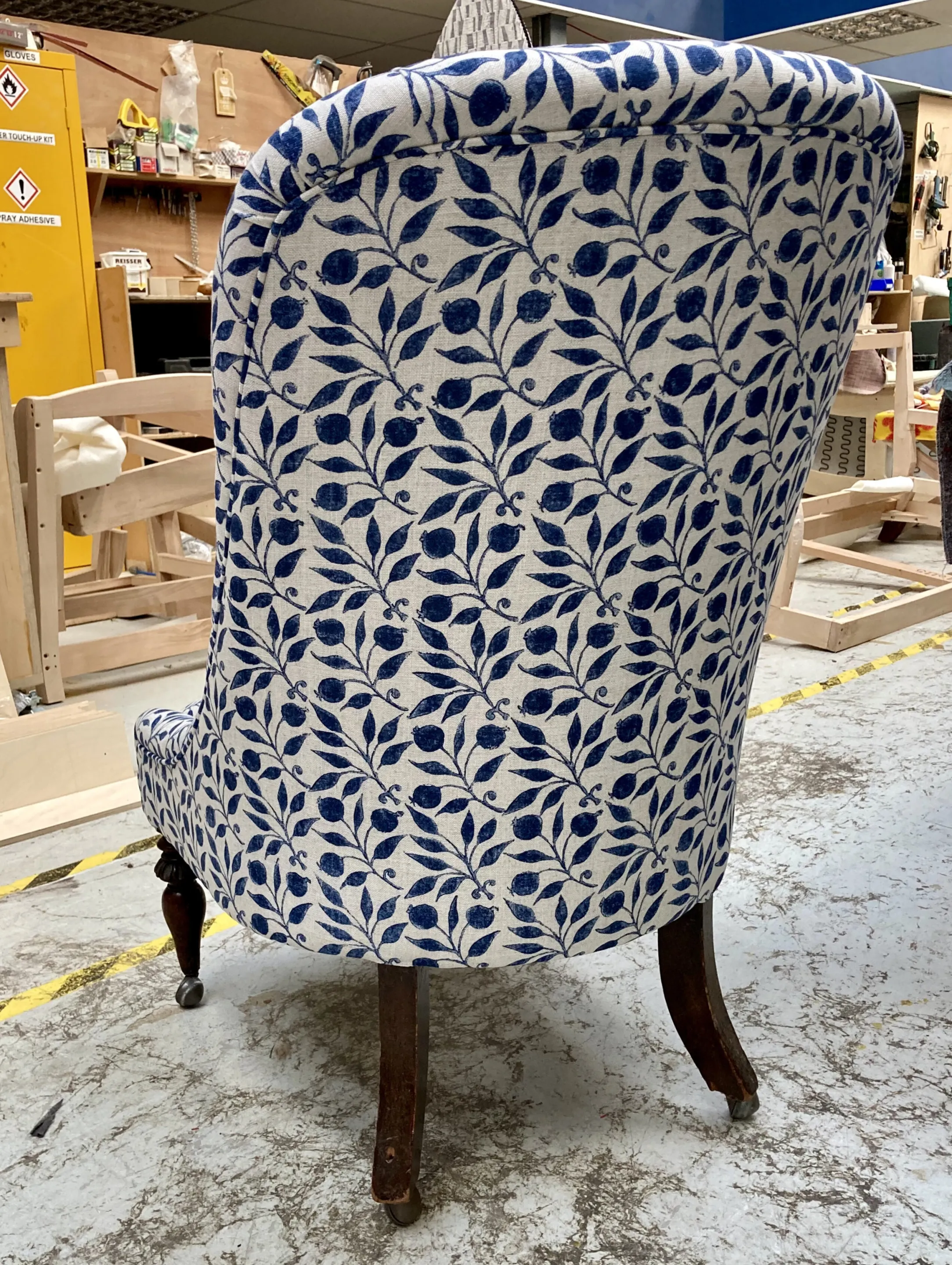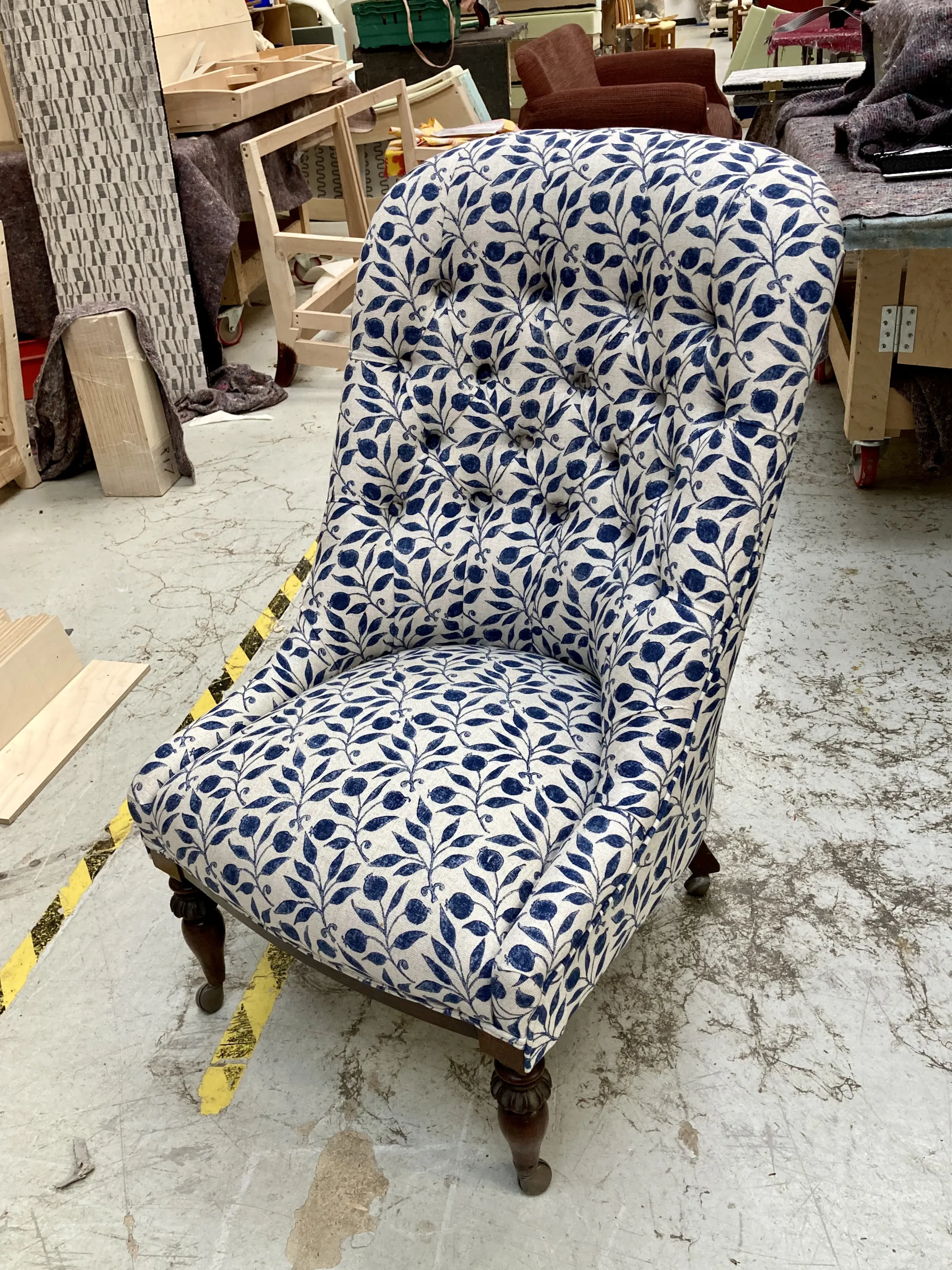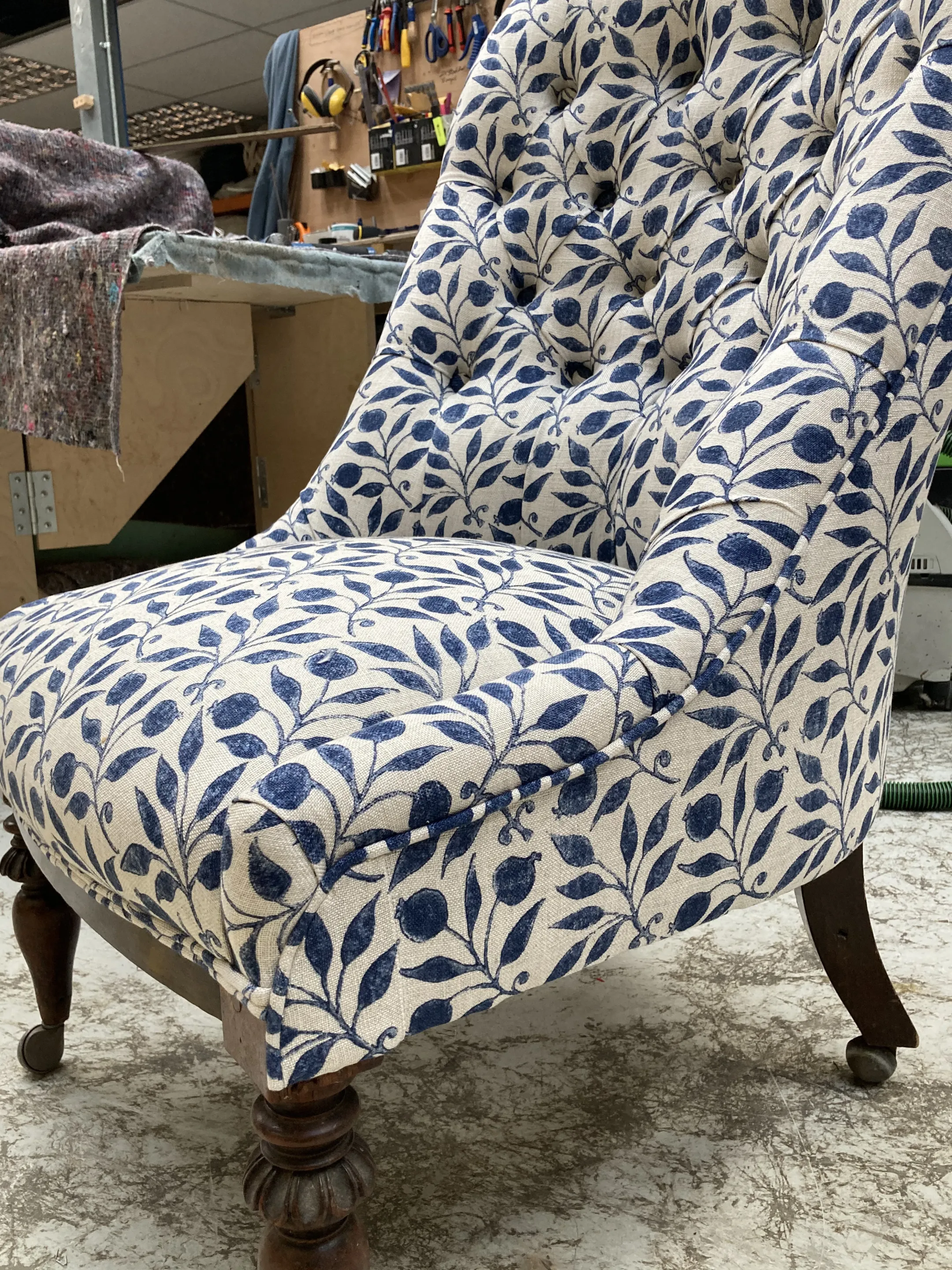 This buttoned back chair has undergone a complete transformation. Stripping off the original fabric we found the original horse hair upholstery. The new fabric is by William Morris and is called Rosehip. The Rosehip design was originally taken from a tile, the motifs were hand cut and hand printed from lino giving an authentic hand block printed look. The fabric interpretation of the pattern creates an interlocking design that works well with the buttoned back of the chair as the pattern organically flows in and out of the buttoning.