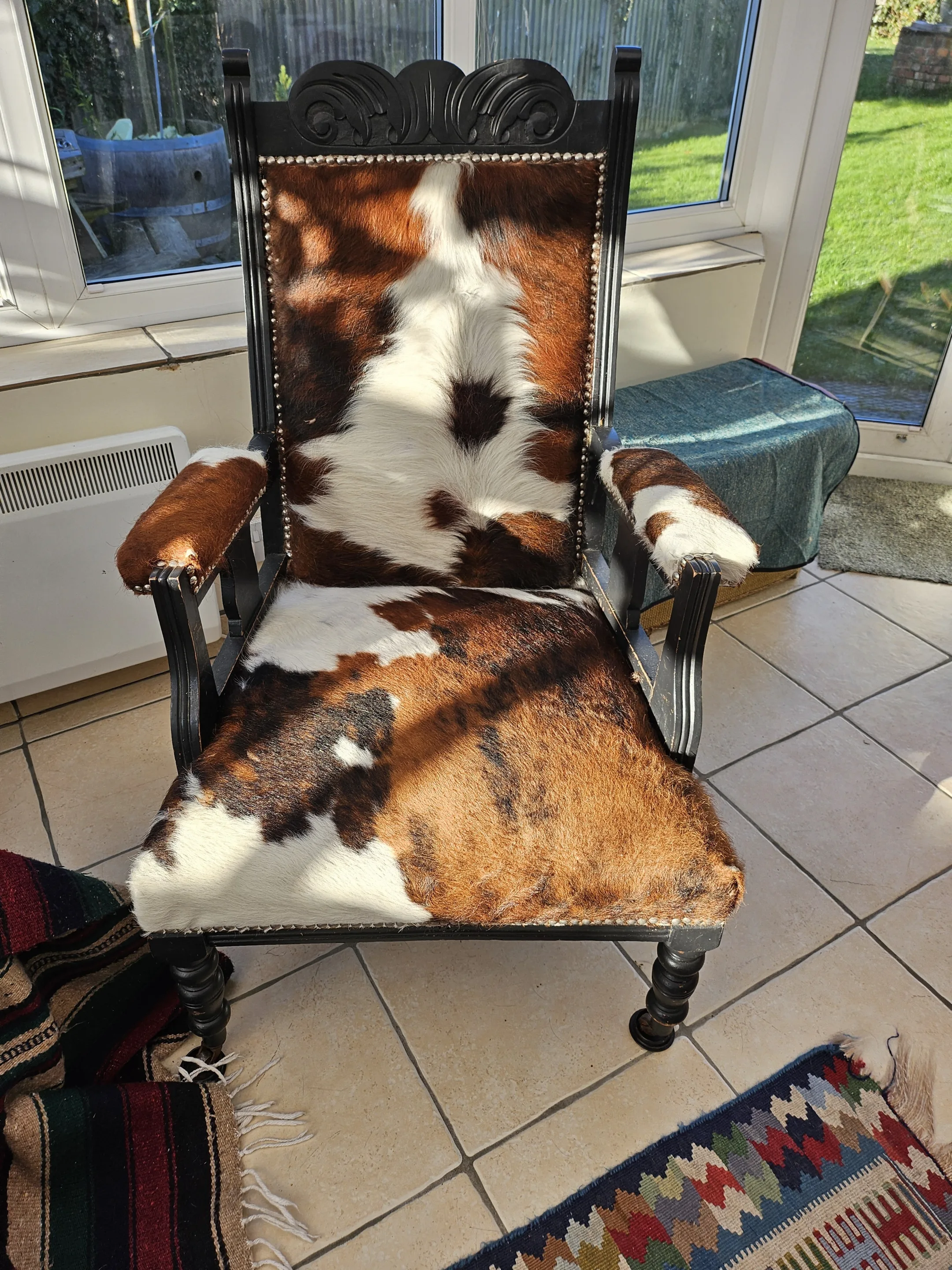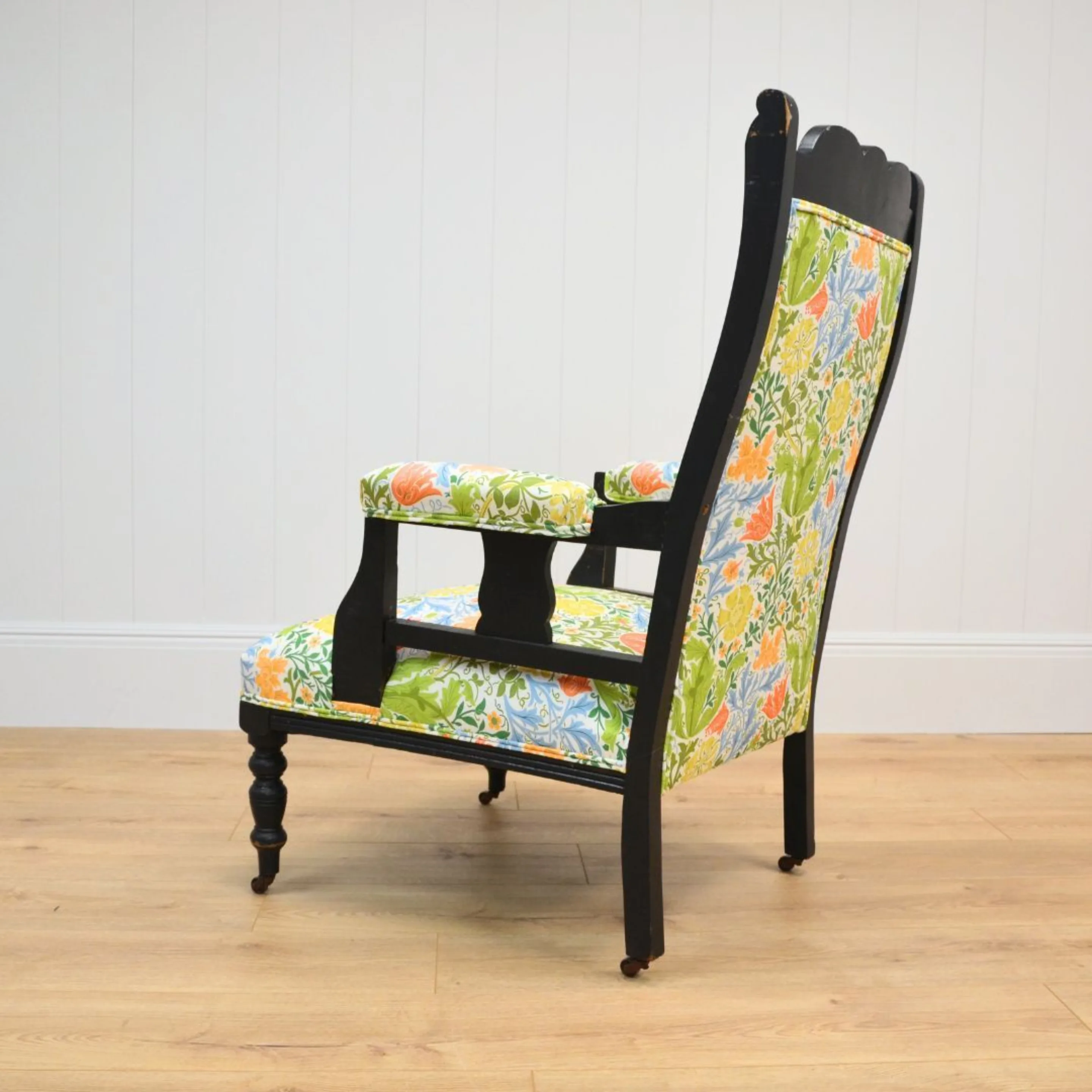 A revived archive print called Compton by John Henry Dearle. The design was commissioned for Compton Hall, Wolverhampton in 1895. It has since been recoloured using a beautiful Spring colour palette. The wooden frame of the chair has been stained using an almost black colour which contrasts the fabric and adds a modern look. A neat double piped edge finishes off the chair perfectly.